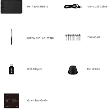 The Huion HS610 Drawing Tablet is a versatile device that allows for easy connection between various devices for data exchange. It is compatible with Windows 7 or later, macOS 10.12 or later, and Android 6.0 or later, but not with iPhone or iPad. The tablet features a battery-free pen with 8192 levels of pressure sensitivity and a comfortable ergonomic design, as well as a touch ring and 12 press keys for customization. The tablet has a work area of 254 x 158.8mm for PC/laptop connection and 158.8 x 99.2mm for Android phone/tablet connection. The device is ultrathin and compact, with a micro USB port and frameless design. It comes with an OTG connector for easy connection to Android devices, and is compatible with popular digital art software. The Huion pen tablet/display is also ideal for remote working and distance learning, allowing for precise recording of handwritten content and compatibility with various applications.
