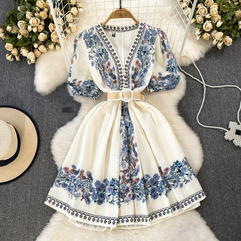 Beach resort style retro women’s summer V-neck printed A-line skirt