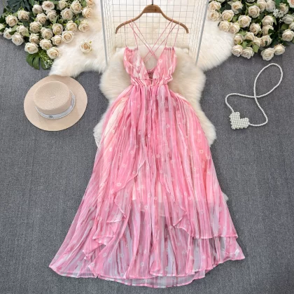 Beach seaside vacation sling waist slimming backless super fairy dress travel photography halter neck tube top long skirt