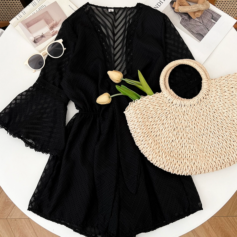| nameOriginal | Beach vacation sexy deep v-neck knotted high-waist slim bell-sleeved jumpsuit wide-leg pants casual pants for women summer |