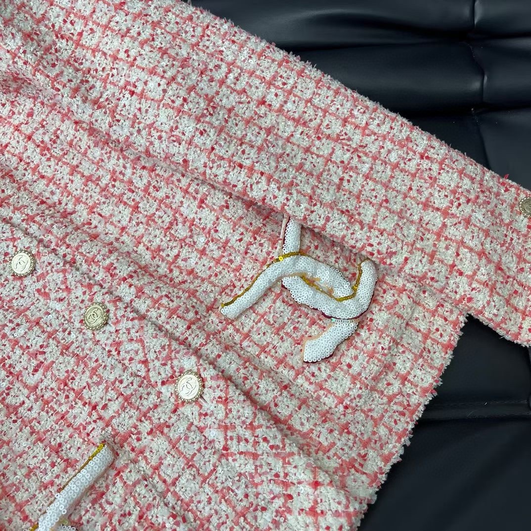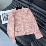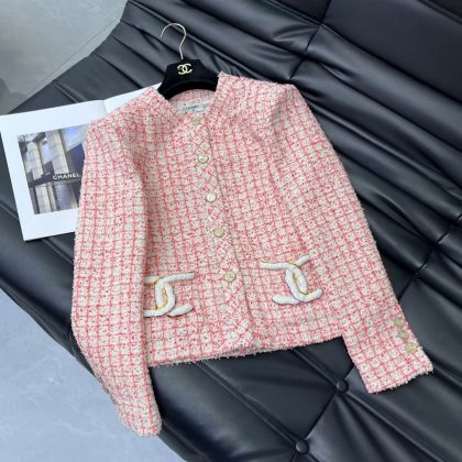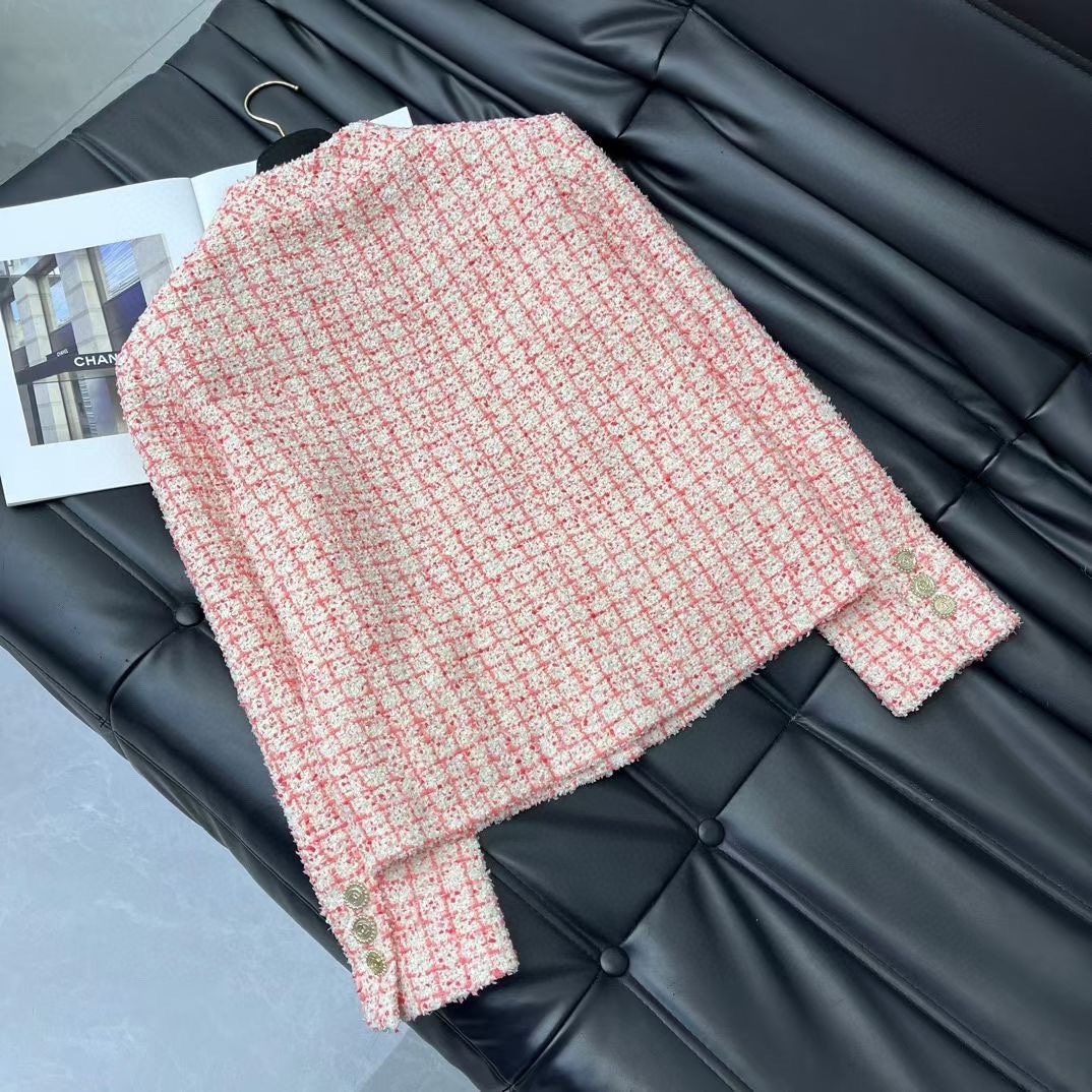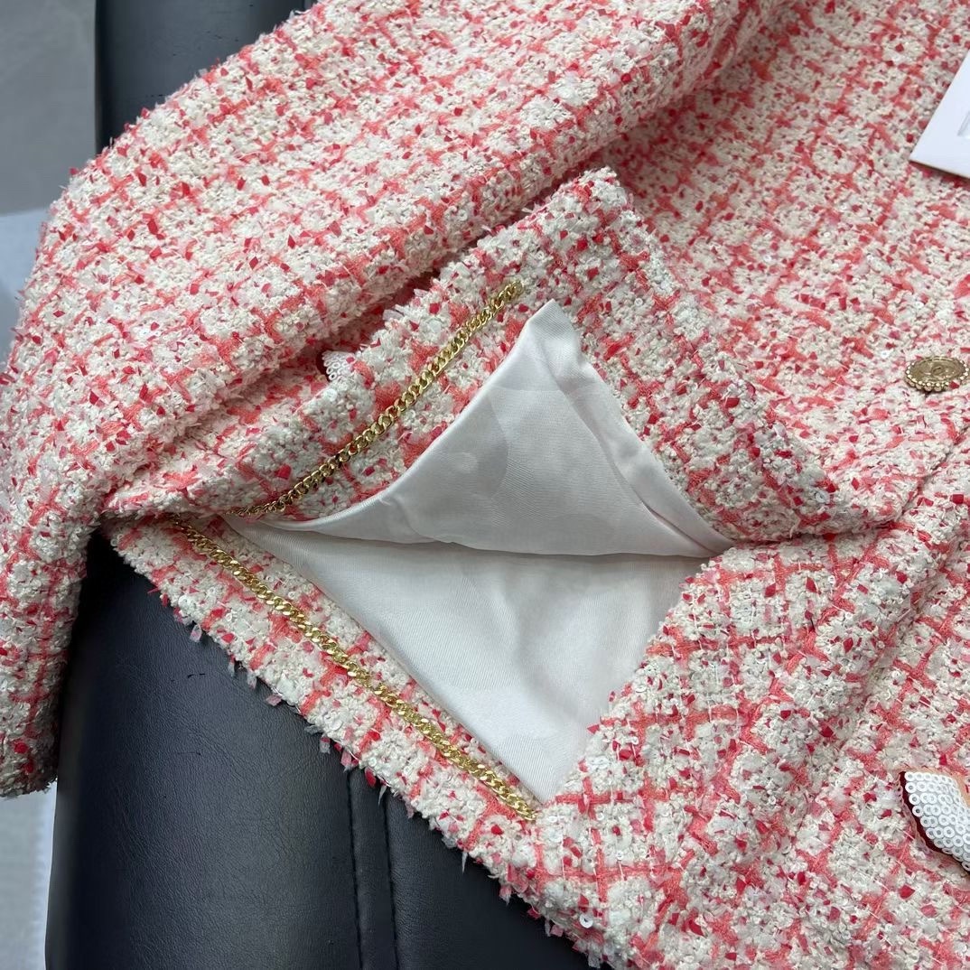 Beaded Slub Jacket Gold Solid Double C Button Decorative Round Neck regular H-shape Cut