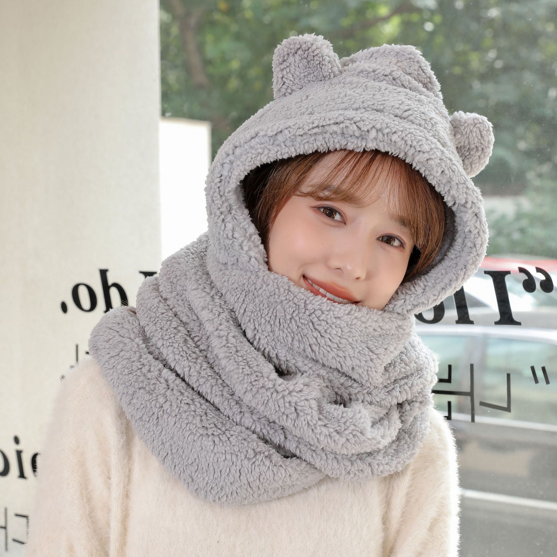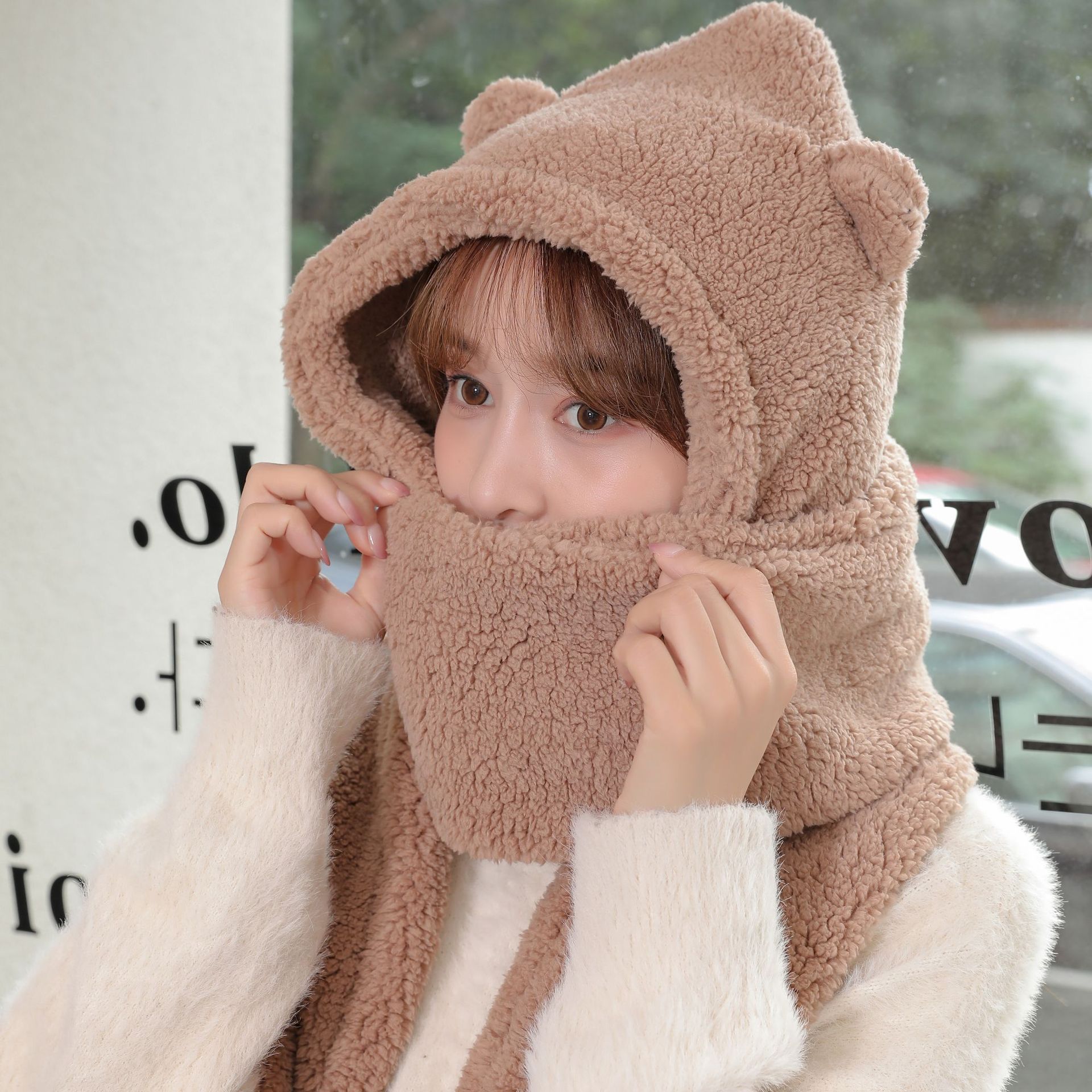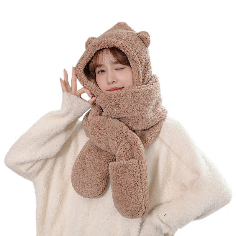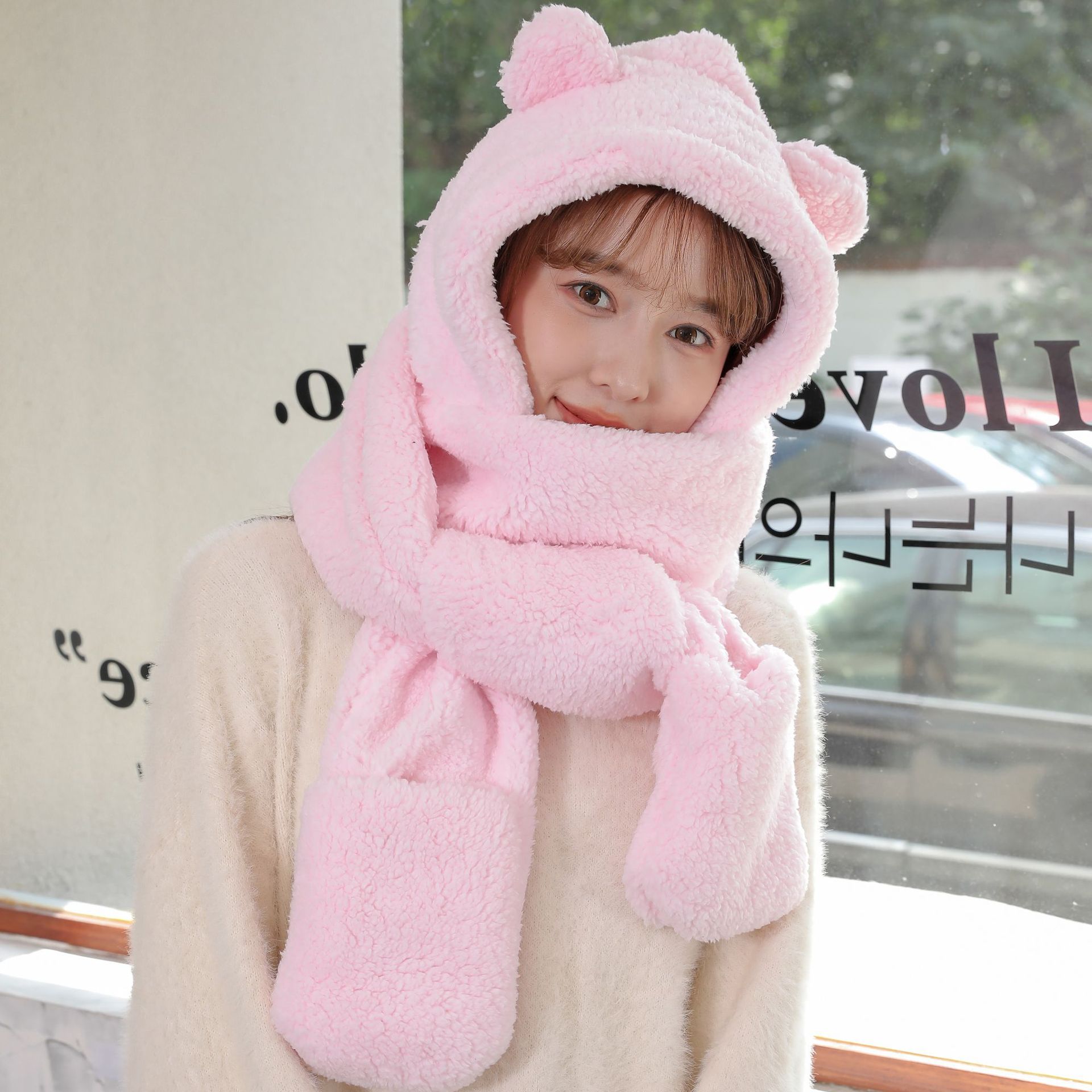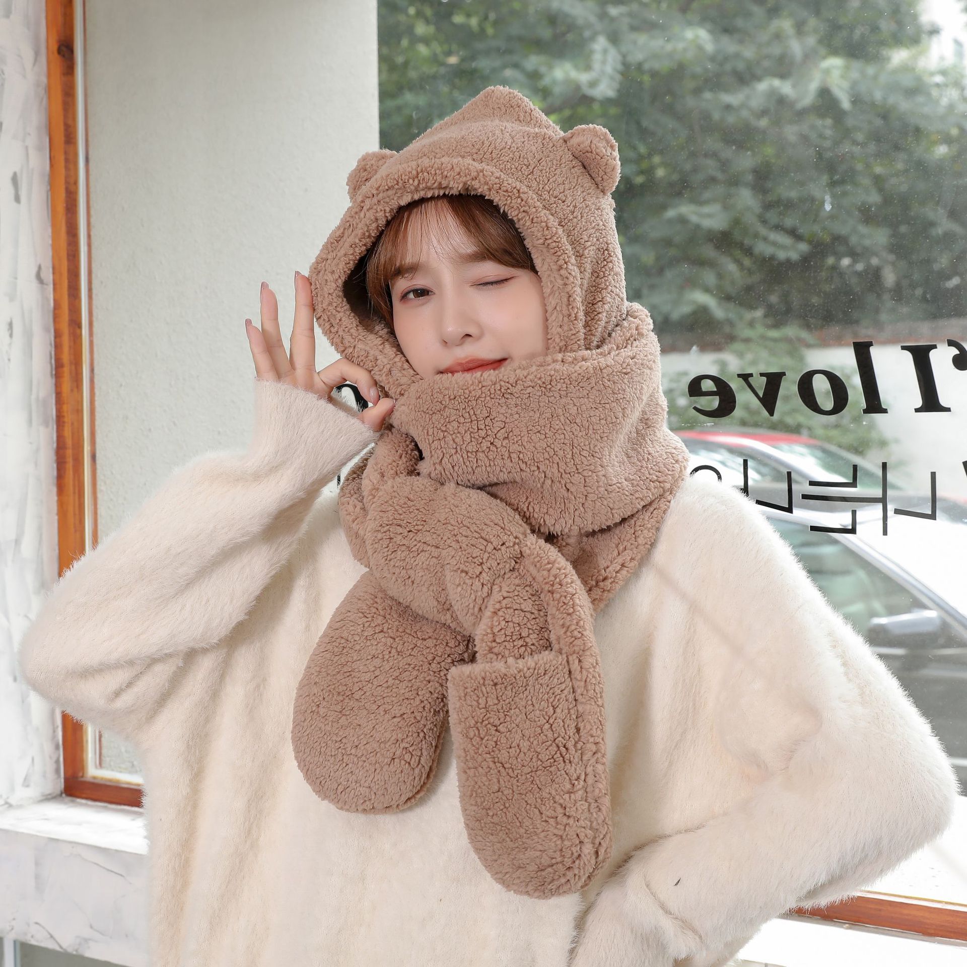 Bear hat gloves scarf three-piece Winter cute fleece-lined coral fleece integrated hooded warm neck hat for women