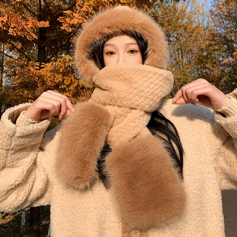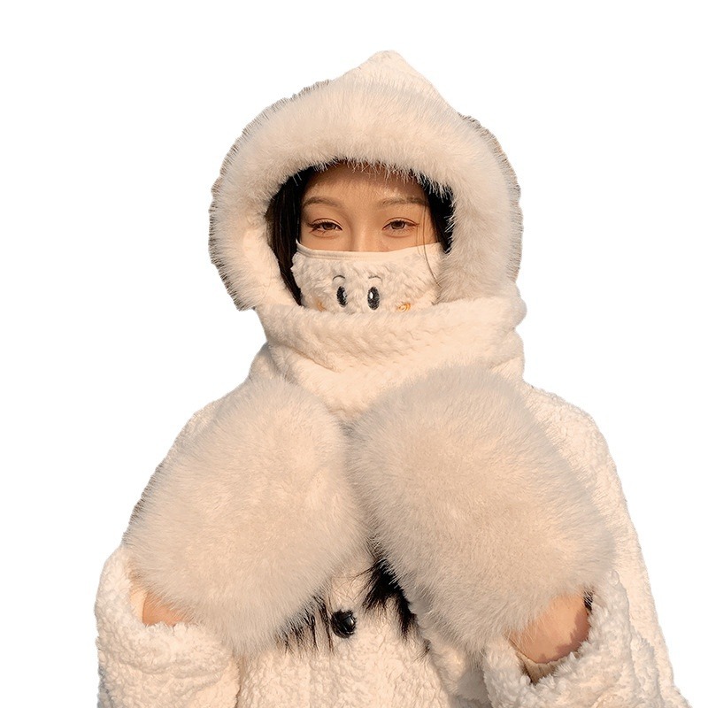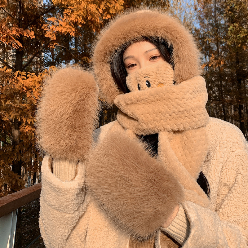 | nameOriginal | Bear hat scarf integrated women's autumn and winter warm ear protection cute plush gloves cycling cold-proof three-piece set |