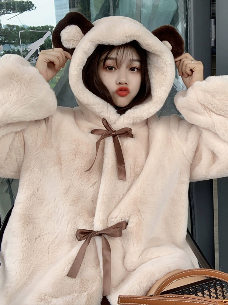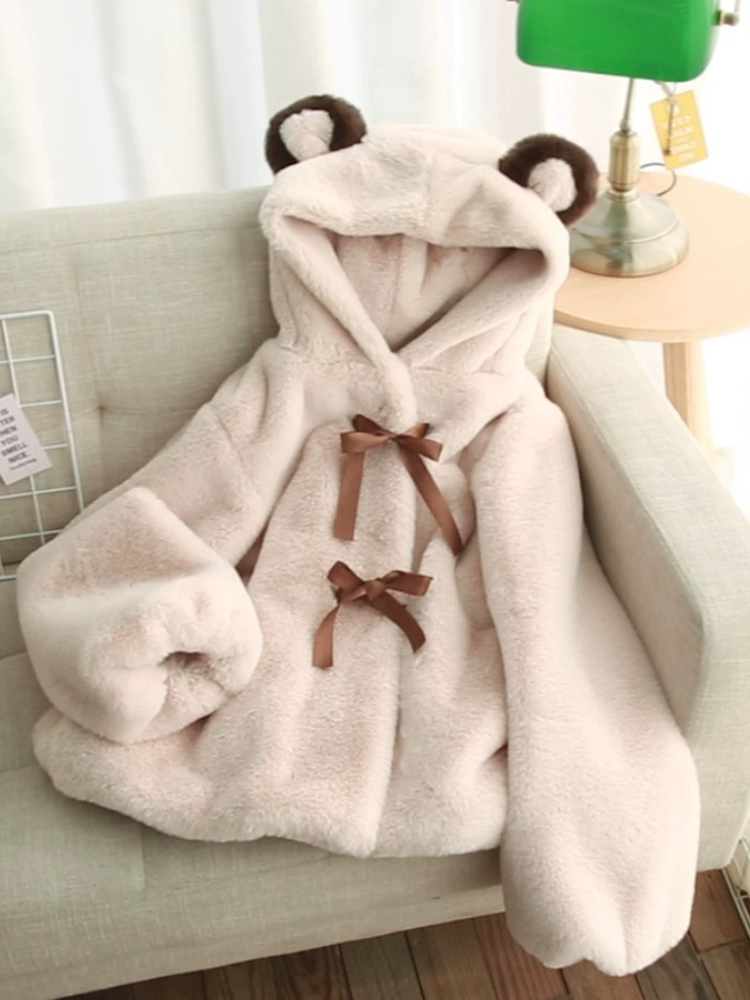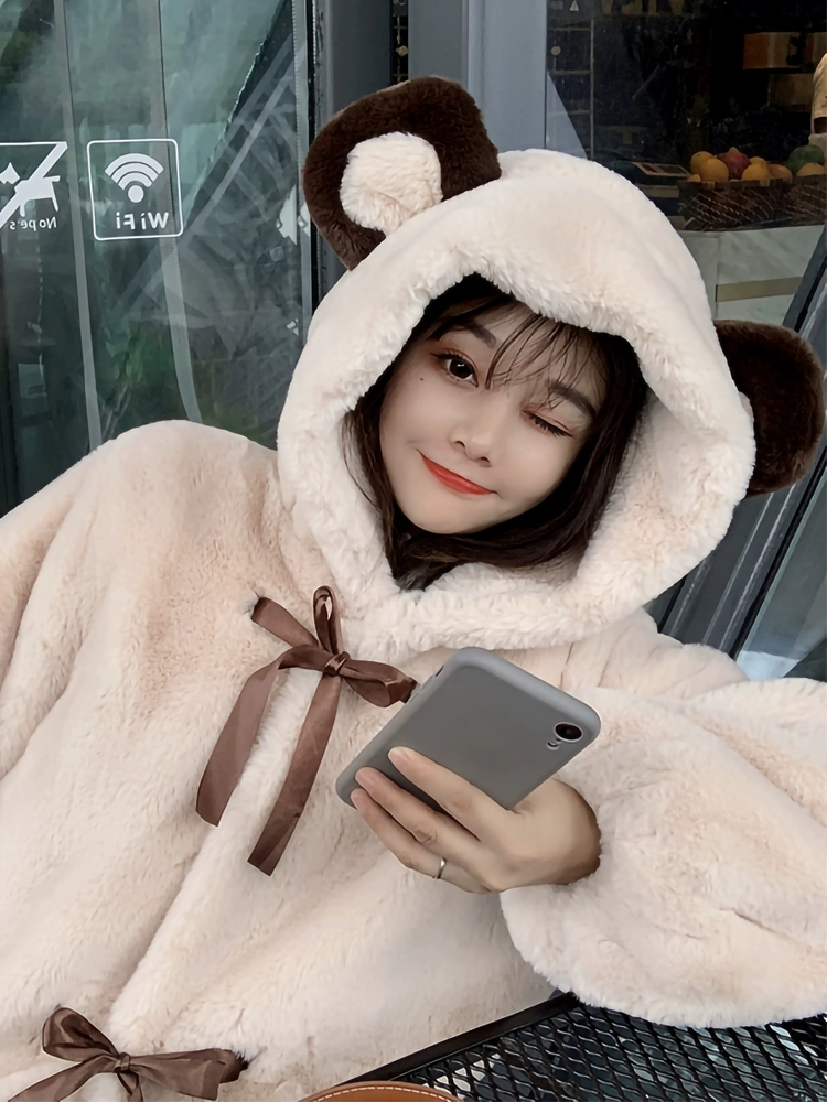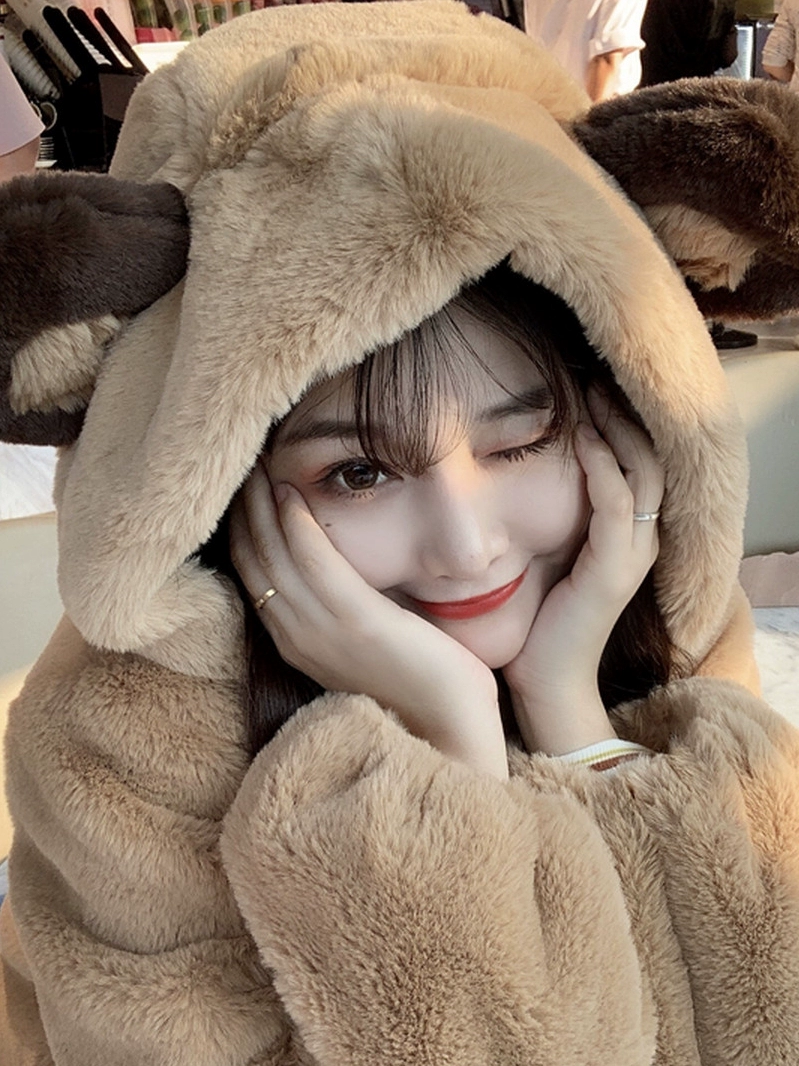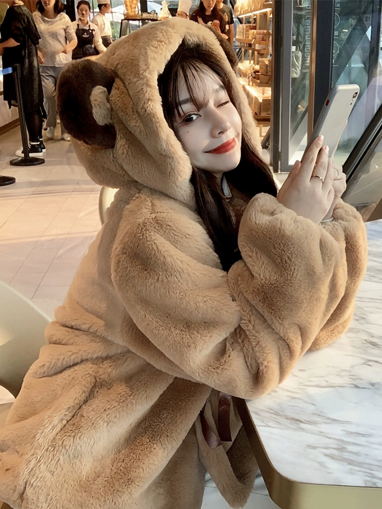 Bear plush coat for women cute eco-friendly fur 2024 winter loose hooded fufu lamb wool coat