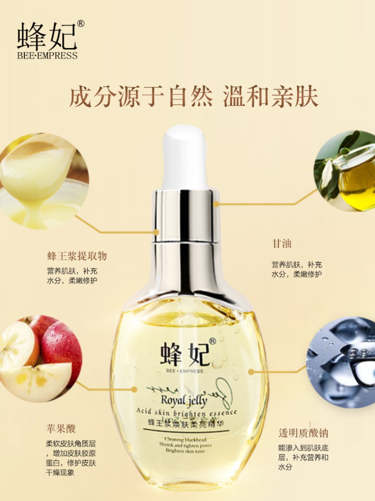 | nameOriginal | Bee Royal Jelly Rejuvenating Essence Cleans Blackheads, Shrinks Pores, Brightens Skin, Rejuvenating Softening Essence |