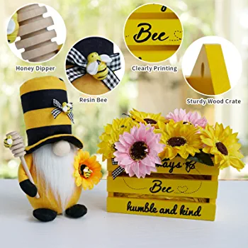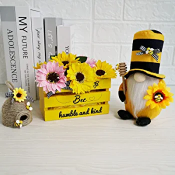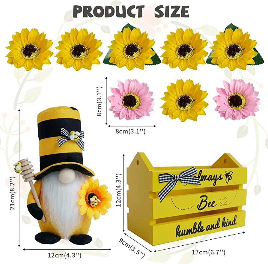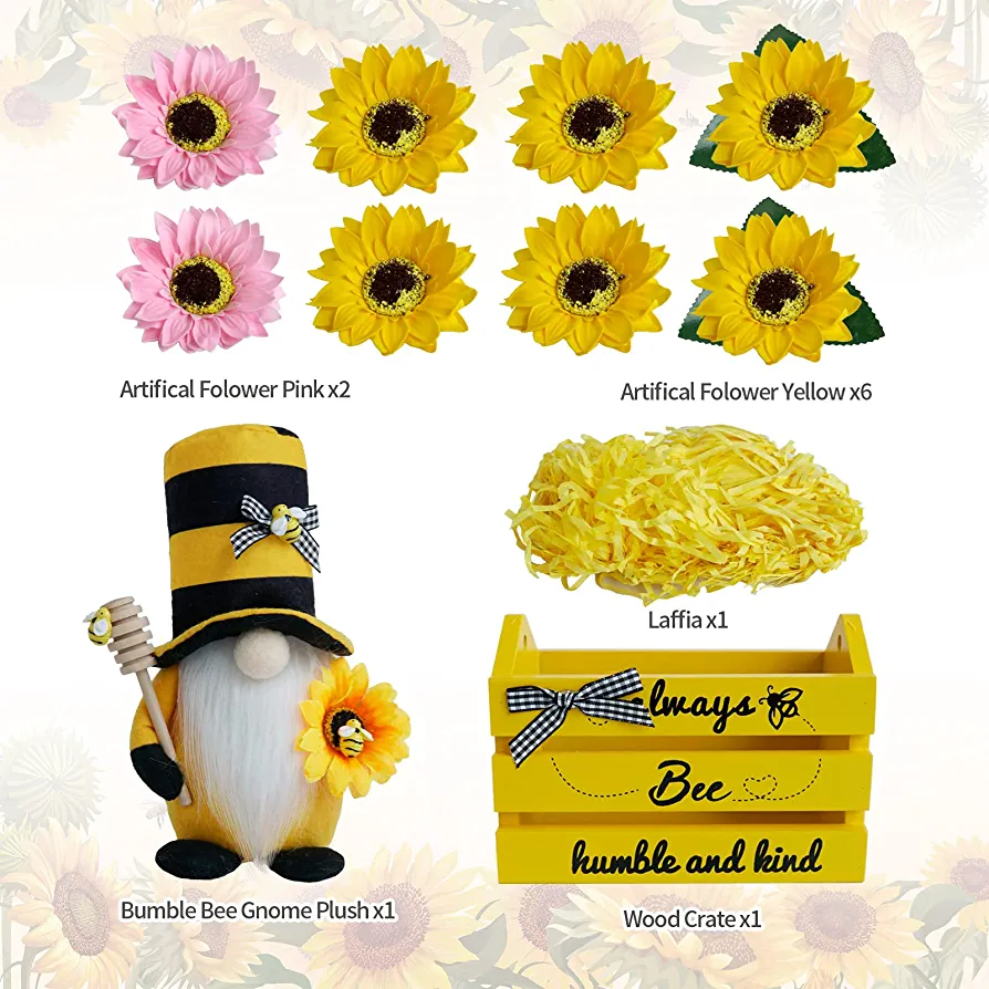 This product bundle includes a Bumble Bee Gnome Plush, a mini bee wood crate, and 10 artificial scented sunflowers (eight yellow and two pink). All items are packaged in a giftable box, and the flowers require DIY assembly to create a beautiful pose.
