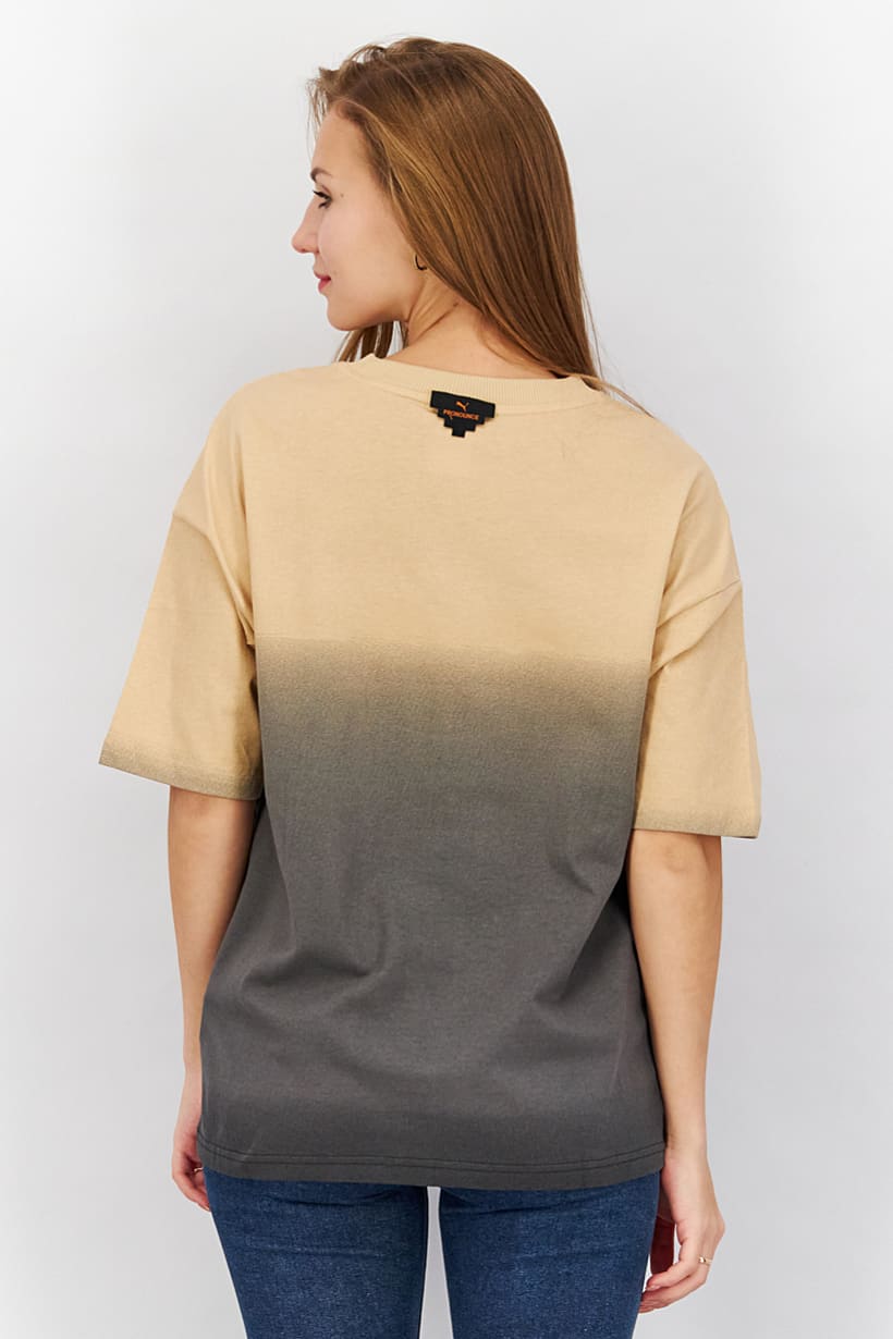This product is made of 100% cotton and is suitable for machine washing. It has a sportswear fit and is designed for training. The t-shirt is light in thickness and features a colorblock pattern and print in beige and grey. Please note that the product color may appear slightly different due to lighting or monitor settings. It is perfect for sports occasions. The size shown is in US measurements.