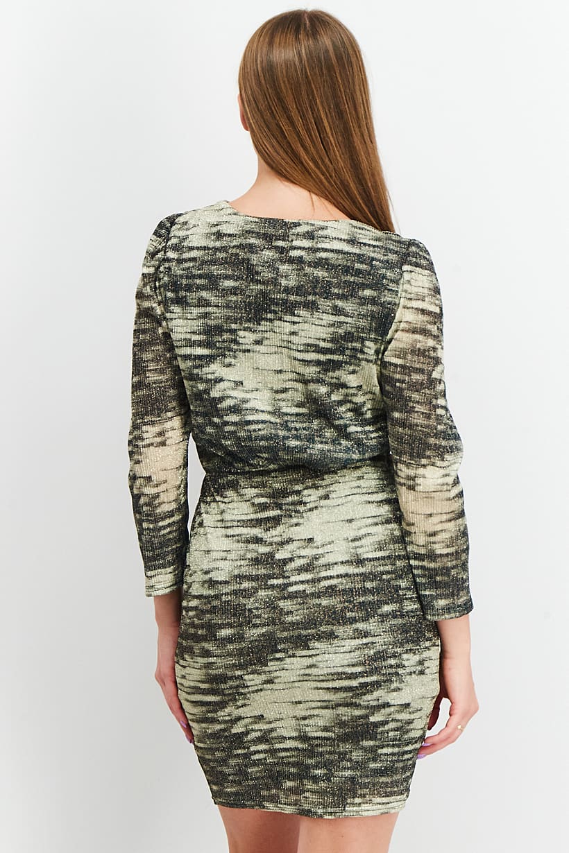 | descriptionOriginal | Care : Machine washable, Dress Style : Mini, Fit : Regular fit, Size shown : International, Types of Hem : Straight hem, Types of Neckline & Collar : Surplice neckline, Types of Sleeve : Longsleeve, Fabrics : 75% Polyester, 25% Metallic, Occasion : Casual, Pattern & Print : Metallic, Types of Closures : Pullover, Color Family : Beige, |