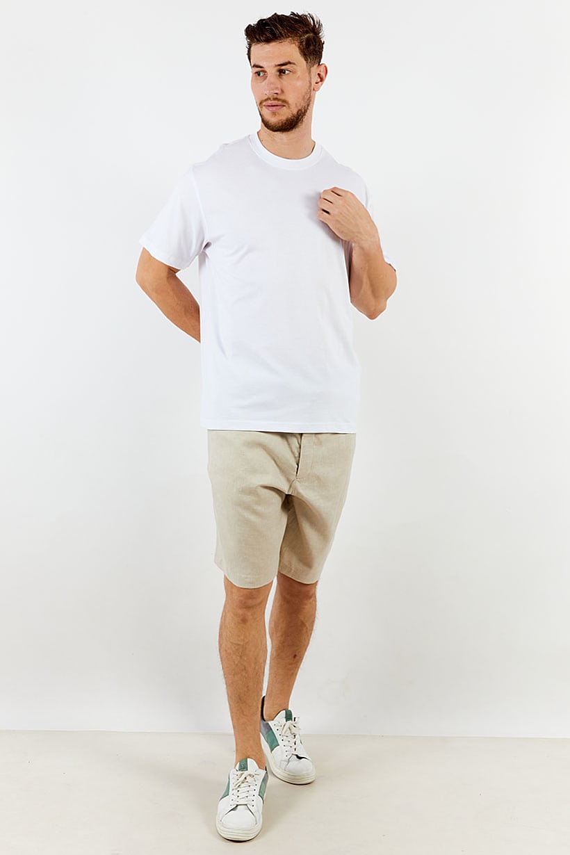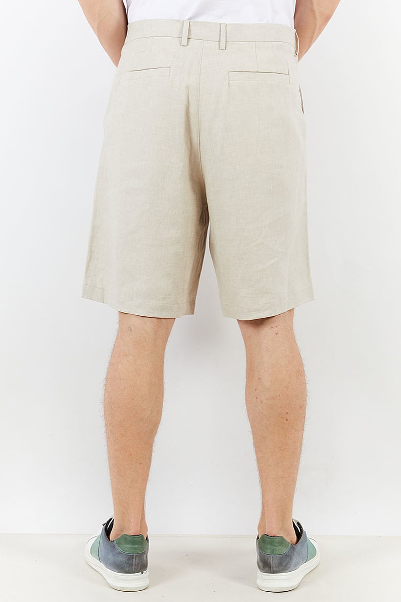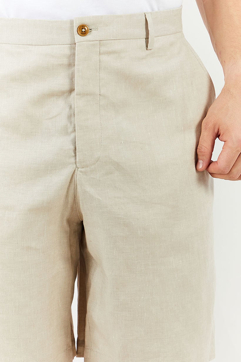 Care : Machine washable, Fit : Regular fit, Ideal For : Men, No of pockets : 4, Size shown : Inches, Stretch Type : Stretchable, Type of Short : Basic short, Bottom Closure : Button, Zipper fly, Fabrics : 62% Linen, 36% Cotton, 2% Elastane, Occasion : Casual, Pattern & Print : Plain/Solid, Color Family : Beige,