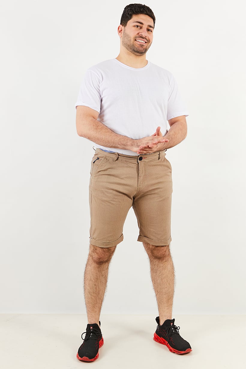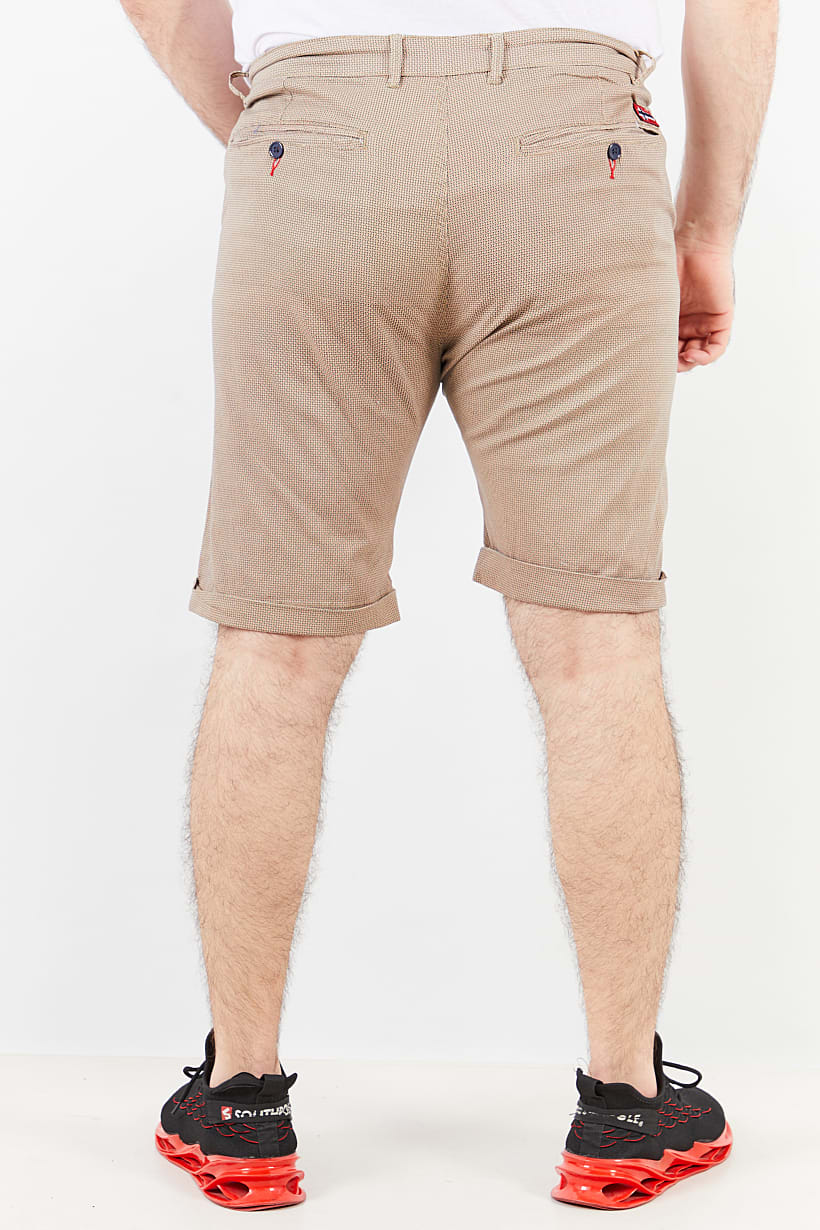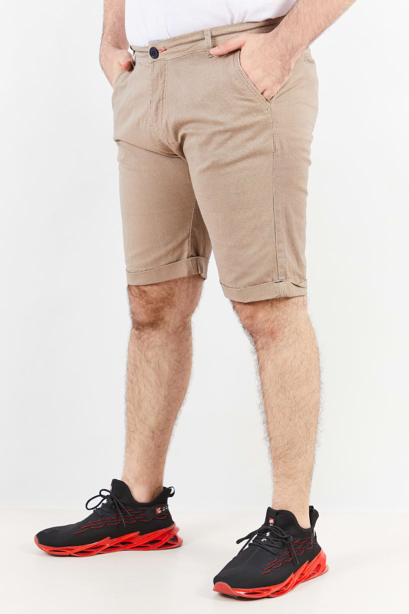 This product features a regular fit basic short with a straight bottom hem and four pockets. It is made of 98% cotton and 2% elastane, making it stretchable and machine washable. The bottom closure includes a zipper fly and button. The diamond pattern and beige color family make it suitable for casual occasions. Please note that the product color may slightly vary due to photographic lighting sources or monitor settings. The size shown is international.