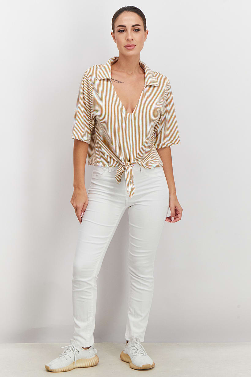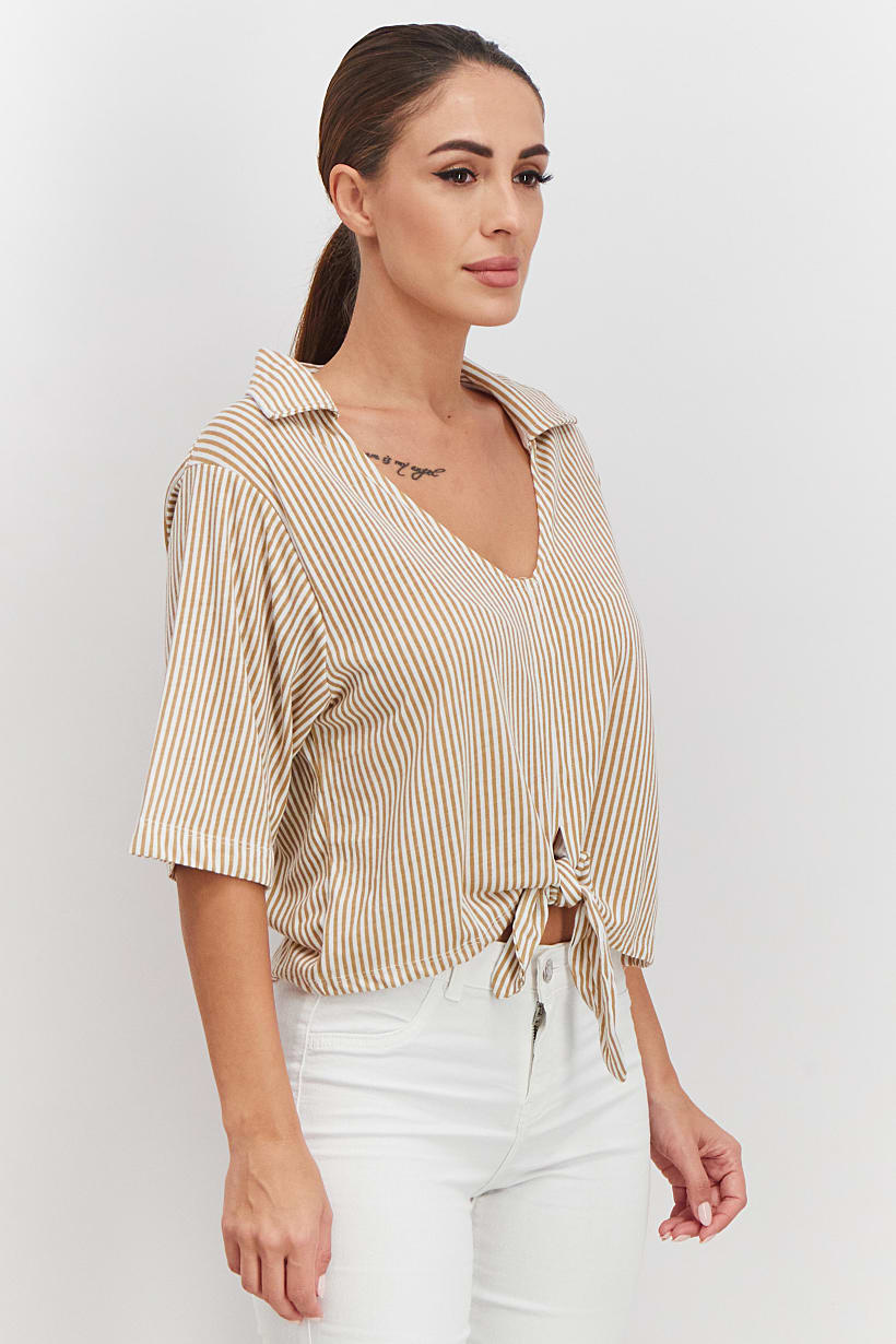 | descriptionOriginal | Care : Machine washable, Fit : Regular fit, Ideal For : Women, Size shown : International, Top Style : Blouse, Types of Hem : Tie hem, Types of Neckline & Collar : V-neckline, Types of Sleeve : Short sleeve, Disclaimer : Product color may slightly vary due to photographic lighting sources or your monitor settings., Fabrics : 50% Viscose, 50% Polyester, Occasion : Casual, Pattern & Print : Stripe, Types of Closures : Pullover, Color Family : Beige, |