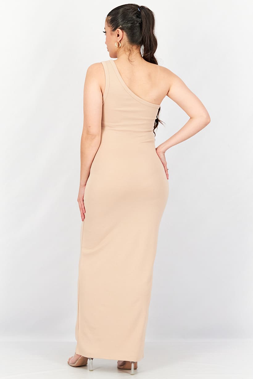 Beige One Shoulder Midi Dress for Women with Asymmetrical Neckline.