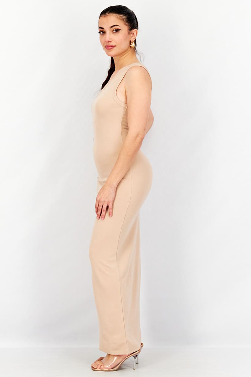 Women Solid Asymmetrical Neckline One Shoulder Midi Dress, Beige