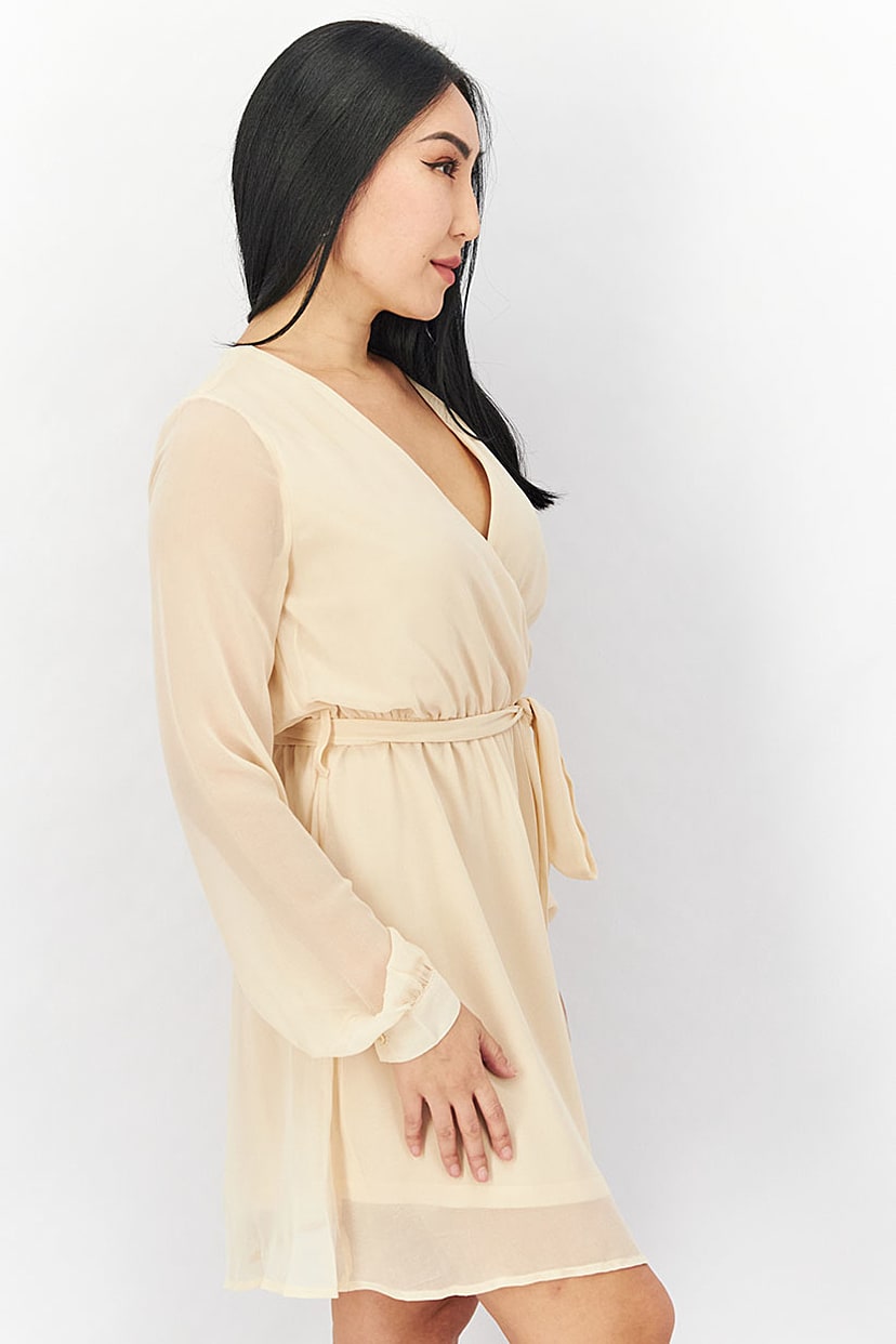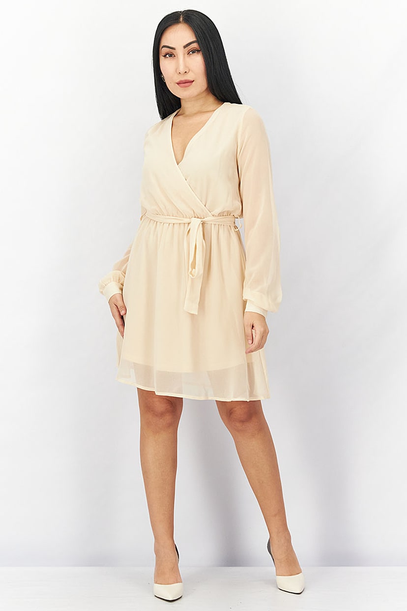 This shift dress is designed for easy care and can be machine washed. It features a regular fit and a straight hem, with a surplice neckline and long sleeves. The dress is made from 100% polyester with a textured pattern, and comes in a beige color family. It has a tie closure and button details. Please note that the product color may vary slightly due to lighting or monitor settings. This dress is perfect for casual occasions.