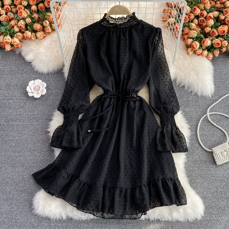 | nameOriginal | Bell sleeves, stand collar, ruffled waist, chiffon dress |
