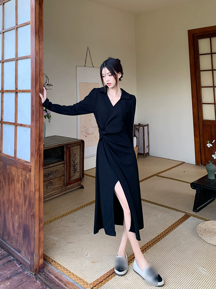 | nameOriginal | Belly-covering, slimming, irregular slit long-sleeved dress |