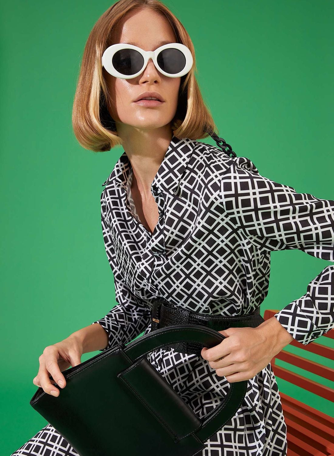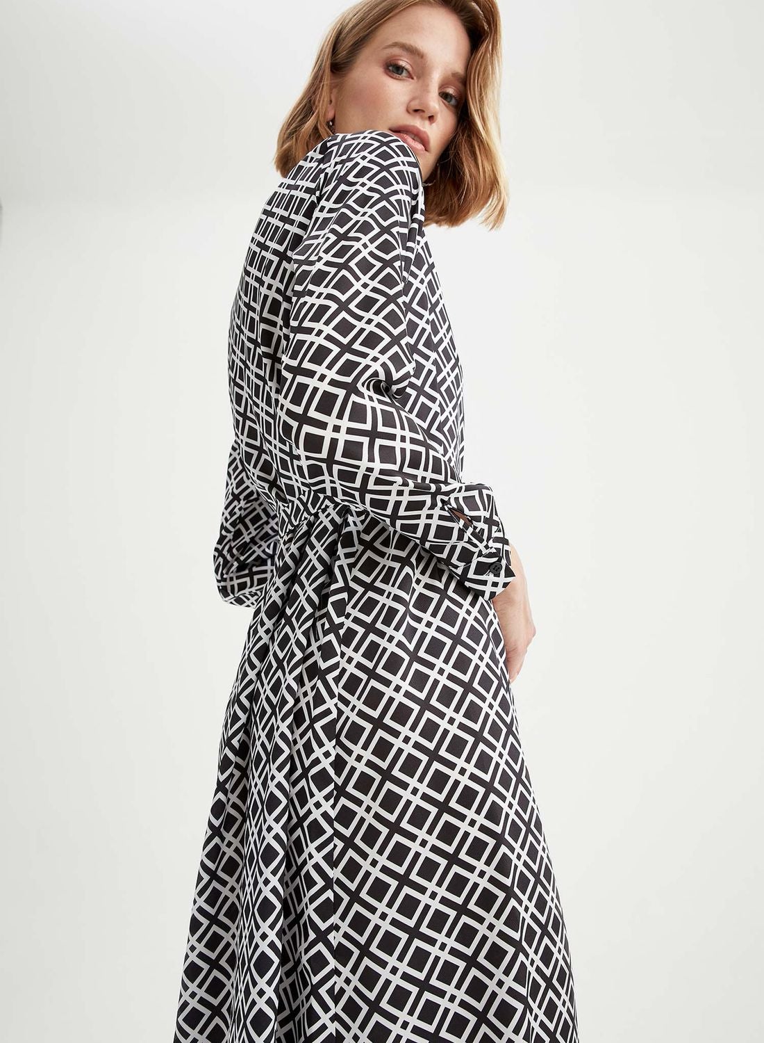 Belted dress with geometric print.