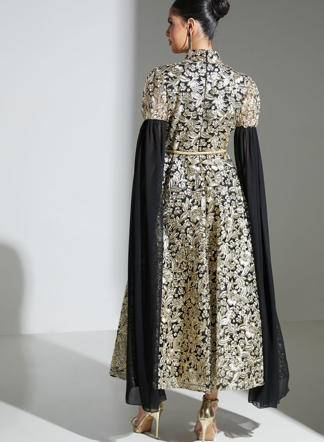 Belted dress with keyhole neck and slit sleeves.