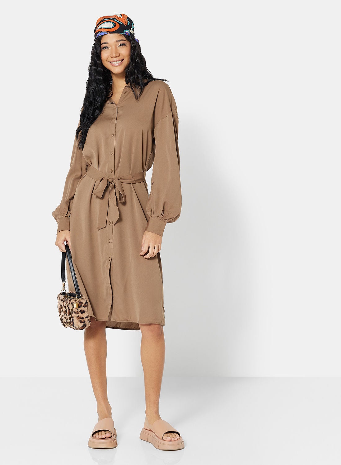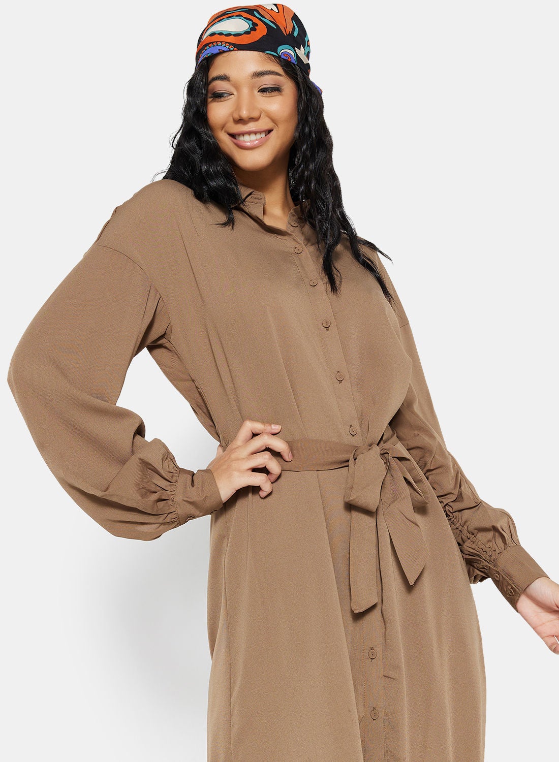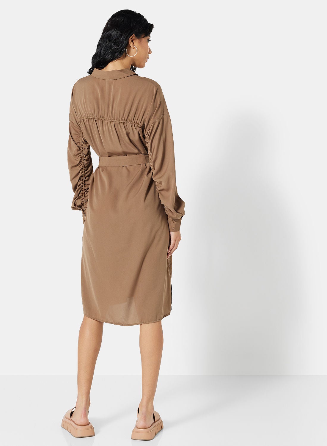 This product features a fabric blend of recycled polyester that is both lightweight and soft to the touch. The collar neck has a button down closure, and the long sleeves have buttoned cuffs. The dropped shoulder seams and adjustable self-tie waist straps provide a comfortable fit, while the ruched details on the reverse add a touch of style. The knee-length design includes dual side slits for added mobility. This product is made from recycled fibres, which helps to conserve natural resources. It is recommended to follow the care label instructions when washing. The model shown is approximately 174 cm tall and is wearing a size S.