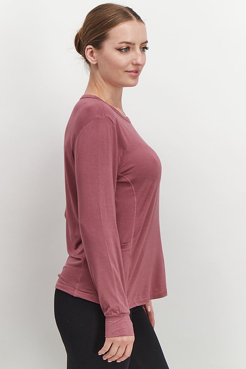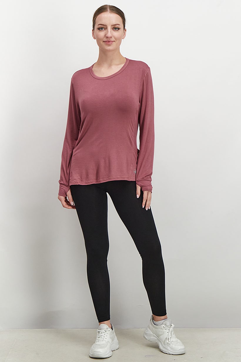 Care : Machine washable, Fit : Sportswear Fit, Ideal For : Women, Size shown : International, Sleeve Length : Long Sleeve, Thickness : Light, Type of Sport : Training, Types of Hem : Straight hem, Types of Neckline & Collar : Crew neckline, Types of Sleeve : Longsleeve, Disclaimer : Product color may slightly vary due to photographic lighting sources or your monitor settings., Fabrics : 95% Rayon, 5% Spandex, Occasion : Sport, Pattern & Print : Plain/Solid, Sportswear Type : T-Shirt, Types of Closures : Pullover, Color Family : Pink,