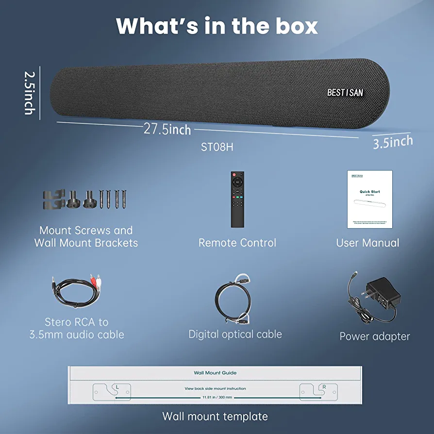 This sound bar boasts 2 full range speakers and 2 tweeter drivers, delivering a powerful 95dB sound with deep bass thanks to the 2 bass tubes. It offers both wired and wireless options, with Bluetooth 5.0 connectivity up to 33 ft / 10 m and various wired connections including HDMI, AUX, RCA, and optical. With DSP Technology, it supports movie, music, and dialogue modes for clear and precise sound, providing an exceptional home theater experience. Its sleek 28-inch design saves space and comes with a power adapter, remote, audio and optical cable, user manual, wall mount accessories, and service card.