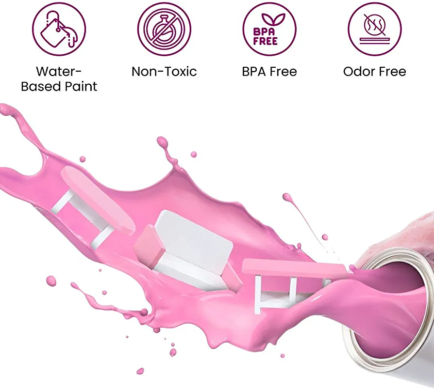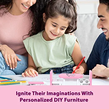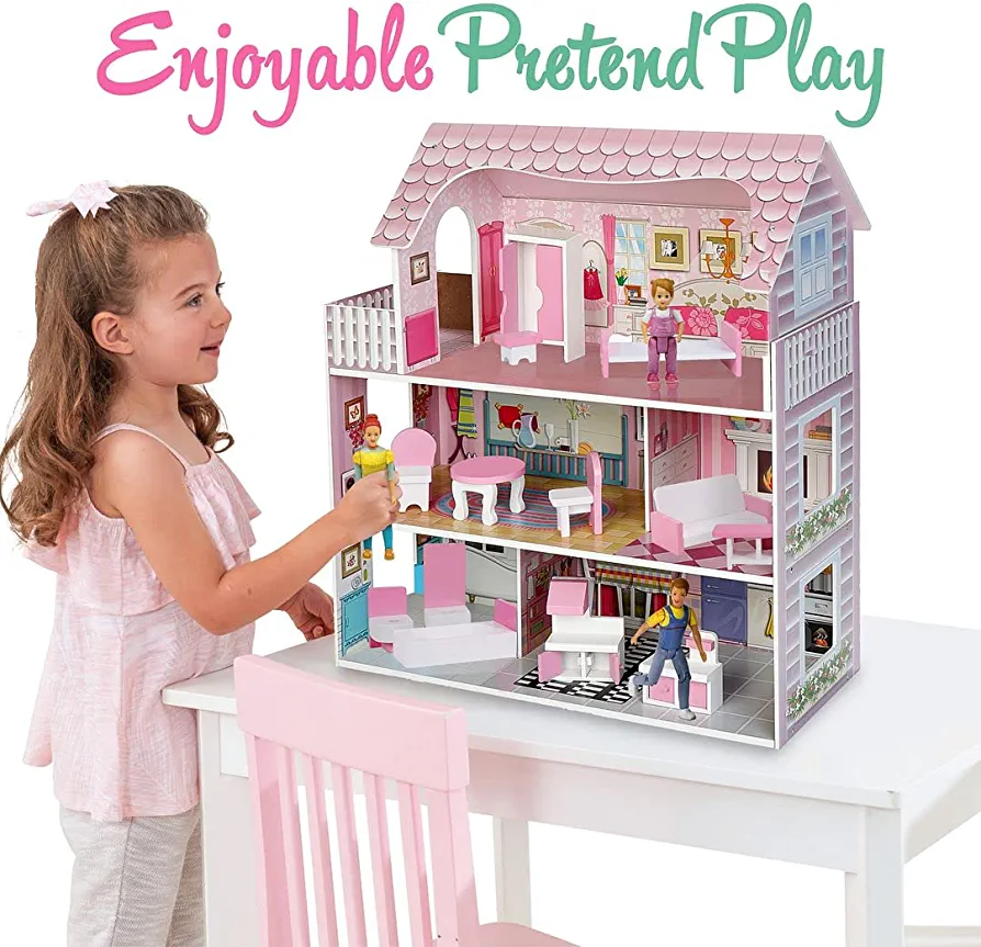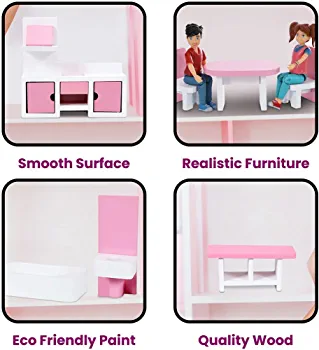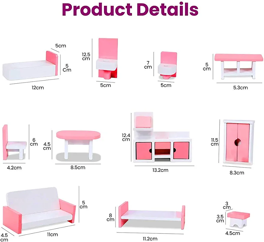 Made from high-quality sourced wood and finished with pink and white pastel colors, this dollhouse furniture set is built to last. Little girls will enjoy every playtime with this toy for years to come. The set includes 12 pieces, such as a kitchenette, counter-top, table with 2 chairs, a sofa bed, closet, bathtub, toilet, and sink. The bed measures 6×3.5 and the table measures 3.5×2.