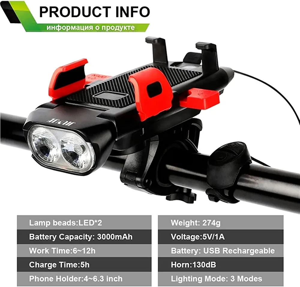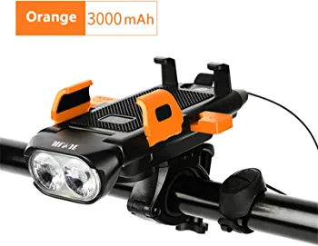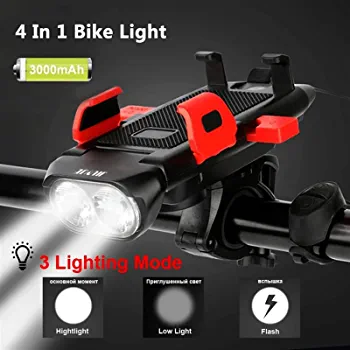 Bike Accessories: USB Rechargeable 4-in-1 Front Light with Horn, Phone Holder, and Power Bank.