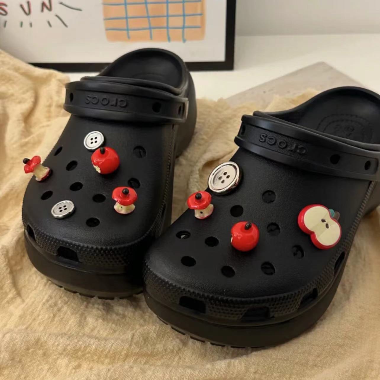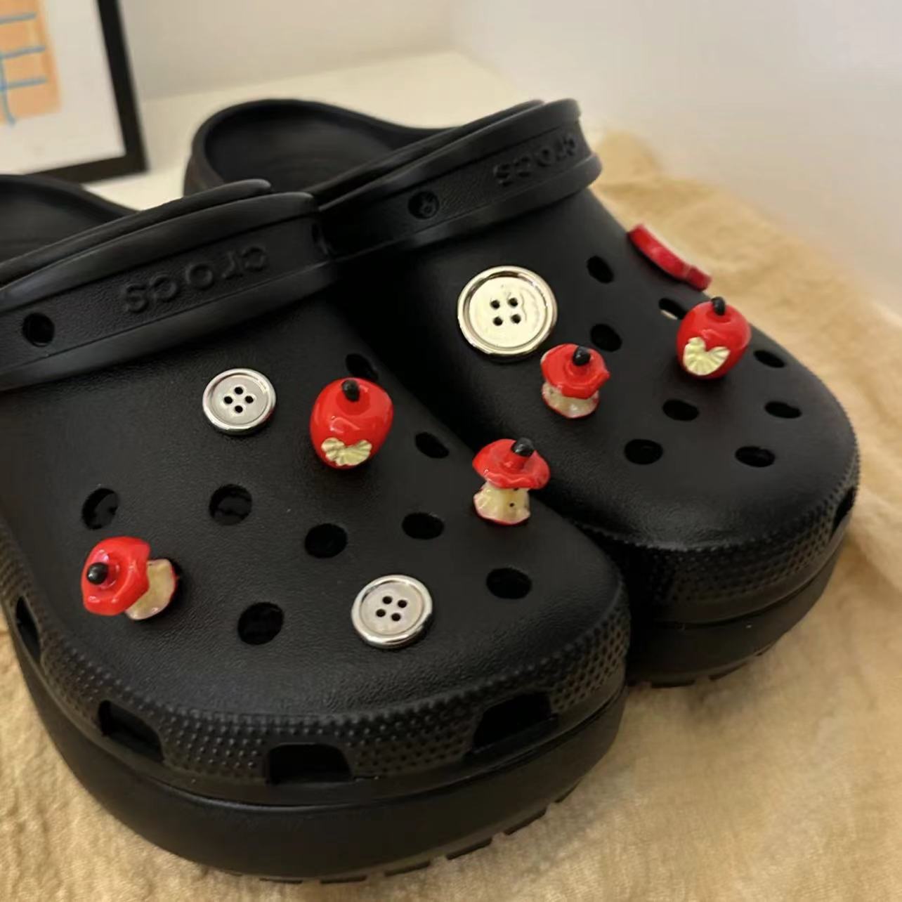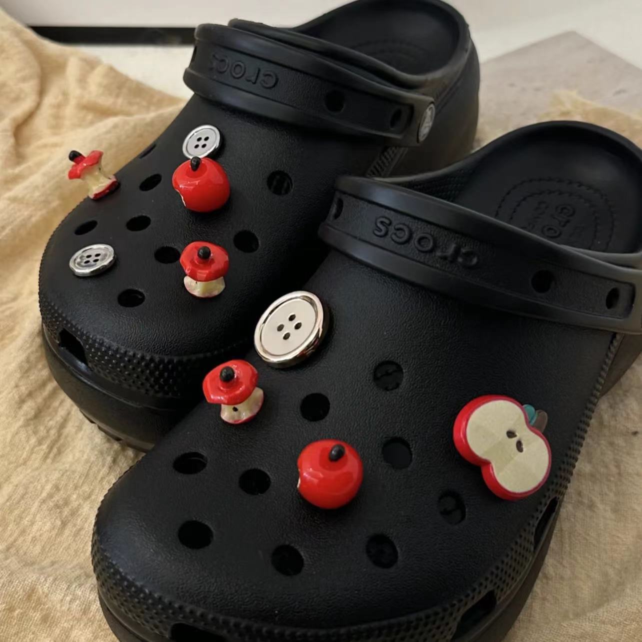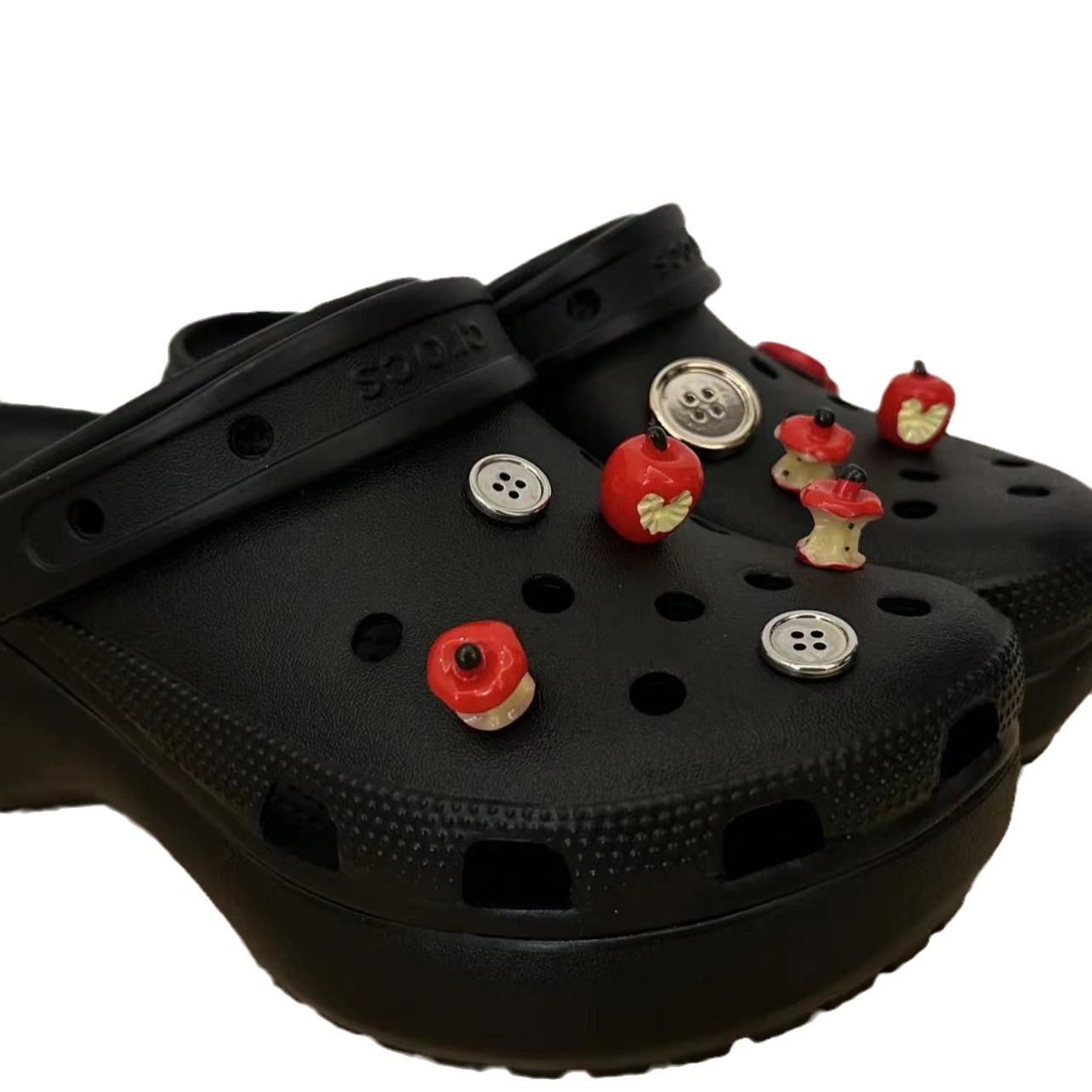 | nameOriginal | Bite a red apple hole shoes shoe buckle diy detachable cute food play button shoe flower upper decoration wholesale |