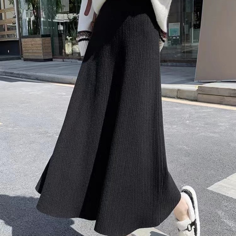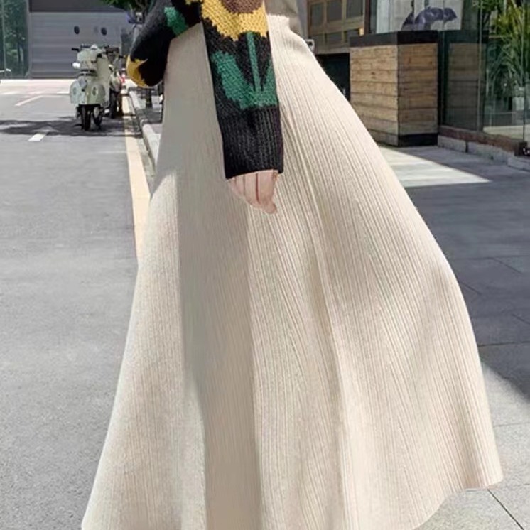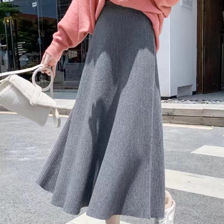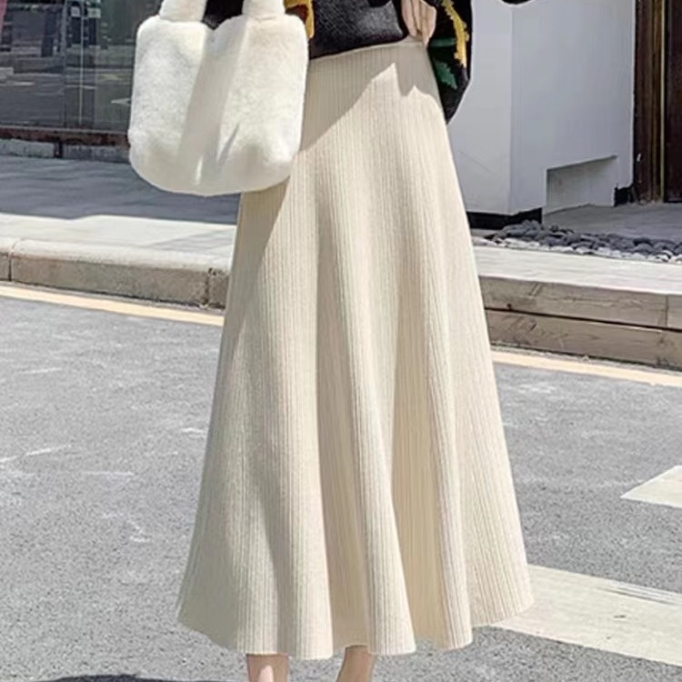 Black A- line skirt women's autumn and winter 2023 new high waist mid-length wool large swing dress thickened knitted skirt