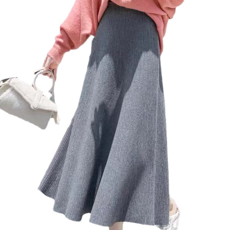Black A- line skirt women’s autumn and winter 2023 new high waist mid-length wool large swing dress thickened knitted skirt