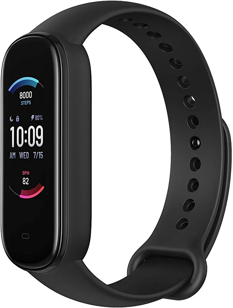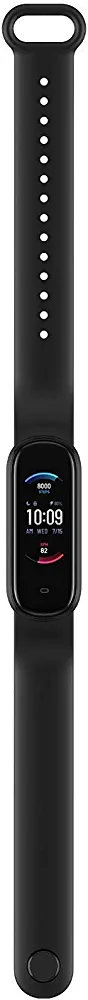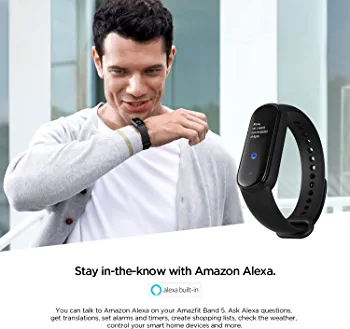 Black Amazfit Band 5 with Alexa, 15-day battery, blood oxygen, heart rate, sleep & stress monitoring, 5 ATM water resistance, fitness watch for all.