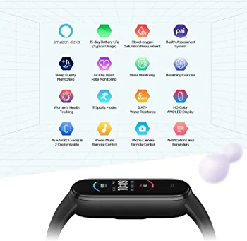 If you're looking for an ideal solution for your health and fitness management, then look no further than Amazfit Band 5 activity fitness tracker. It provides all-around health management including blood-oxygen-level measurement, 24/7 heart rate monitoring, sleep quality & stress level tracking, breathing exercise, and menstrual cycle tracking. What's more, Amazfit Band 5 incorporates a professional health assessment system — PAI, offering one single score to understand your overall physical health. Focus on your workout and exercise with built-in 11 sports modes. And It works even underwater with 5 ATM water resistance. Featuring a brand-new 1.1” full-touch color AMOLED screen and 45+ watch faces, the Amazfit band 5 fitness watch matches seamlessly your personal style. Stay In-the-know with built-in Amazon Alexa. Boasting a powerful battery to deliver up to 15 days of endurance under a typical usage scenario. Compatible with Android 5.0 or iOS 10.0 and above devices.
