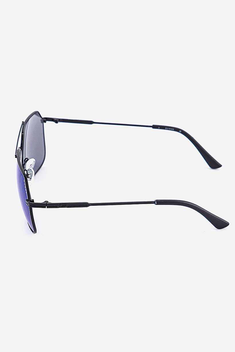 This product boasts a sleek black frame with a full rim design, complemented by blue lenses that provide protection against harmful UV rays. The lenses are made of high-quality acetate material, and the sunglasses also feature adjustable nose pads for added comfort. The color family of this product is blue.