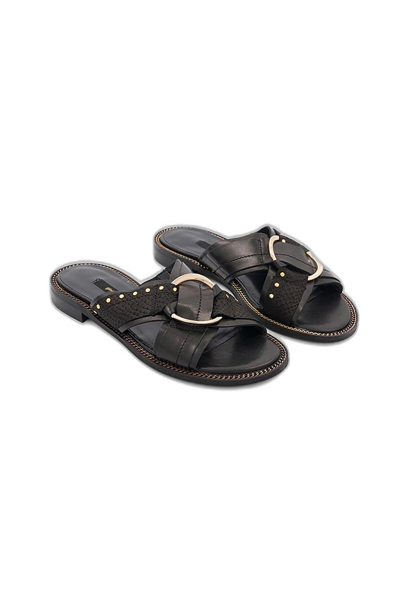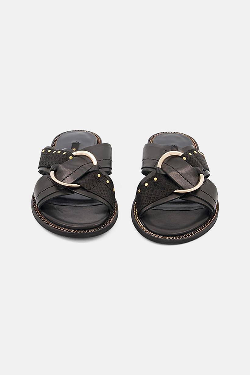| sub_Categories | Shoes, Sandals & Slippers, women snake skin slip on sandals black and gold |