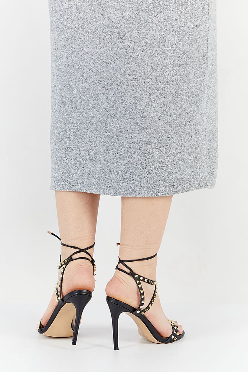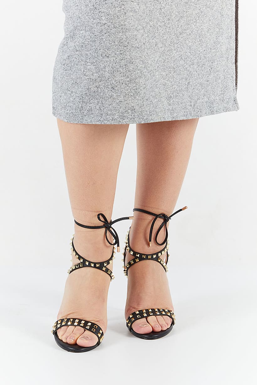 Heel Height : 4.25" / 10.7 cm, Heel Style : Stacked heel, Ideal For : Women, Shoe Closure : Tie closure, Sole Material : Synthetic sole, Toe Style : Open toe, Disclaimer : Product color may slightly vary due to photographic lighting sources or your monitor settings., Occasion : Casual, Shoe Material : Synthetic Leather, Color Family : Black, Embellished : Stud,