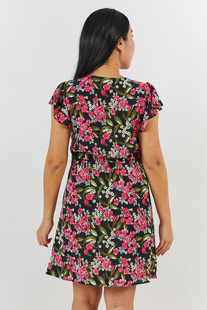 Women Clothing, Dresses, women floral flutter sleeve mini dress black and green combo