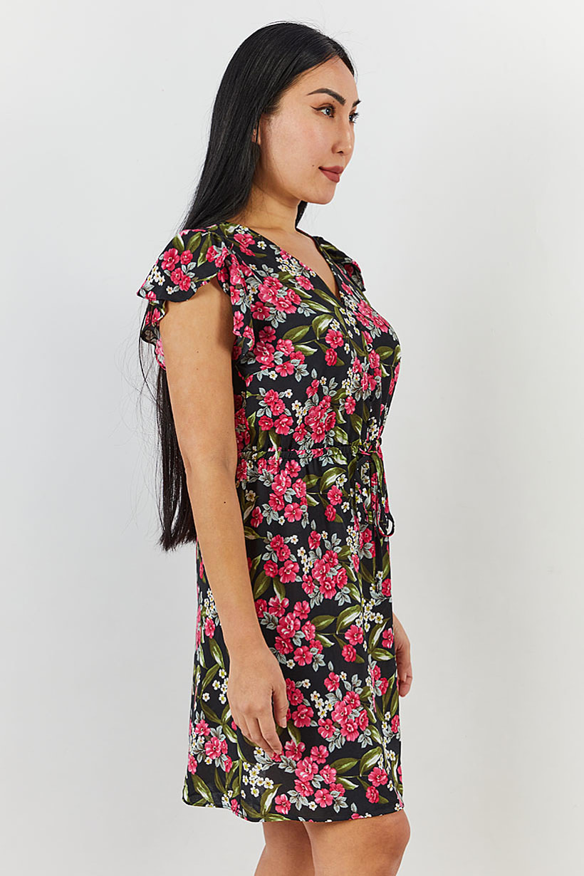 Care : Machine washable, Dress Style : Mini, Fit : Regular fit, Size shown : EU, Types of Hem : Straight hem, Types of Neckline & Collar : V-neckline, Types of Sleeve : Flutter sleeve, Disclaimer : Product color may slightly vary due to photographic lighting sources or your monitor settings., Fabrics : 100% Polyester, Occasion : Casual, Pattern & Print : Floral pattern, Types of Closures : Pullover, Color Family : Black,