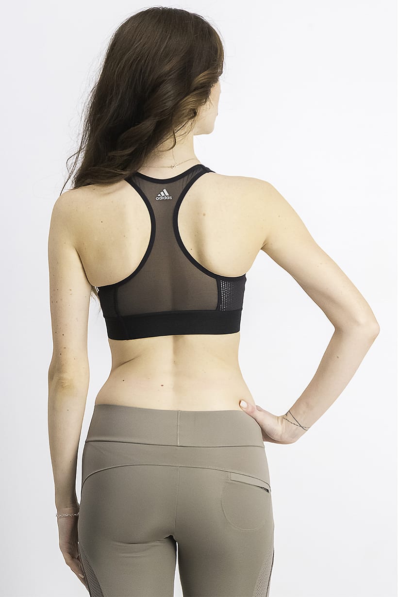 This sports bra is designed for training and has a sportswear fit. It is made of a light and breathable fabric blend of 79% nylon and 21% elastane. The product is machine washable and the brand logo is printed on it. The color of the product may slightly vary due to photographic lighting sources or monitor settings. The size shown is international and the color family is black.