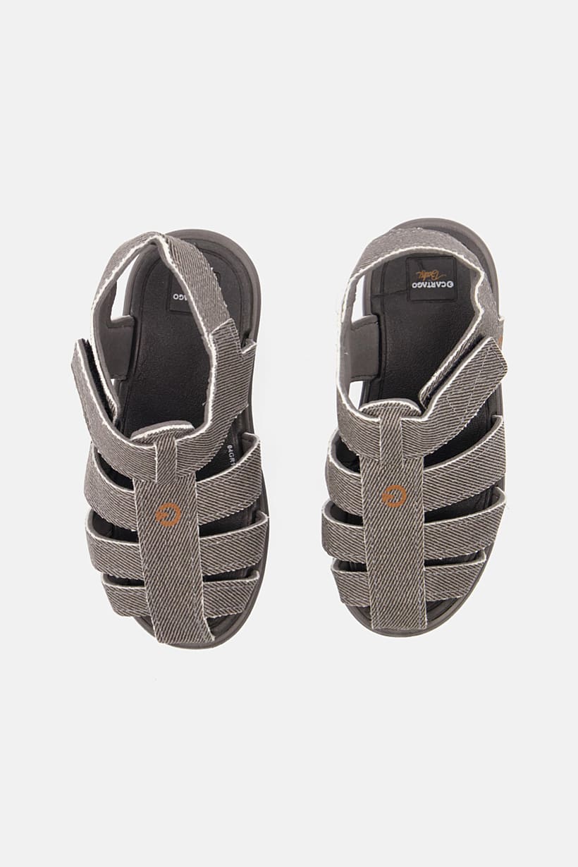 This product is perfect for young boys and features a lightly padded insole for added comfort. The shoe is designed with a convenient velcro closure and a synthetic sole. The open toe style does not feature any specific character design. Please note that the box is not included. This shoe is ideal for casual occasions and is made with a fabric material in a black and grey color family.