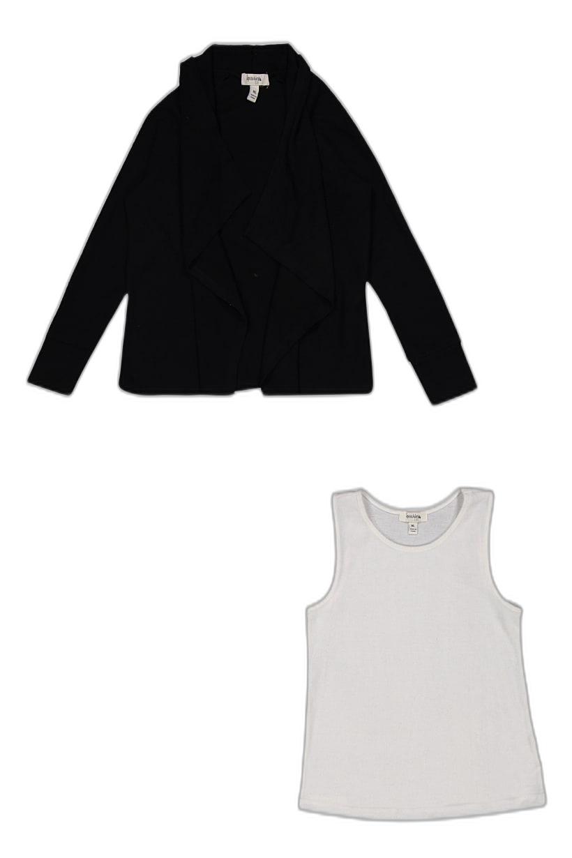 | sub_Categories | Girls Fashion, Girls Tops & Tees, kids girl 2 piece sleeveless top with cardigan set black ivory |