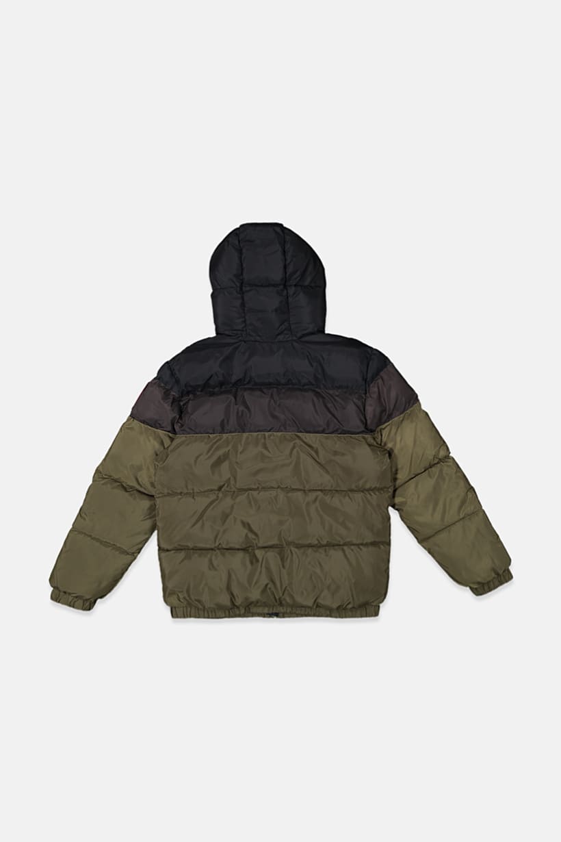 | sub_Categories | Boys Fashion, Boys Jackets & Outerwear, kids boy printed logo puffer jacket black and olive |