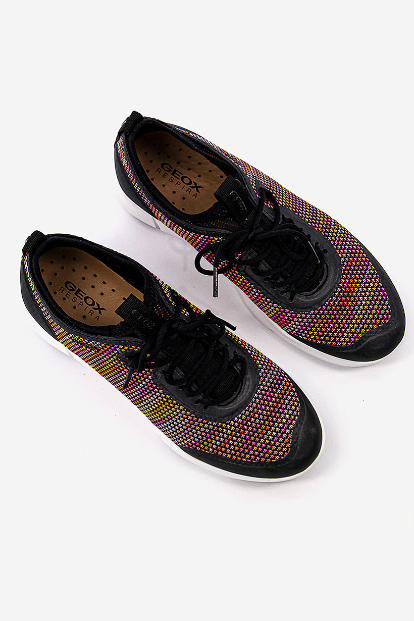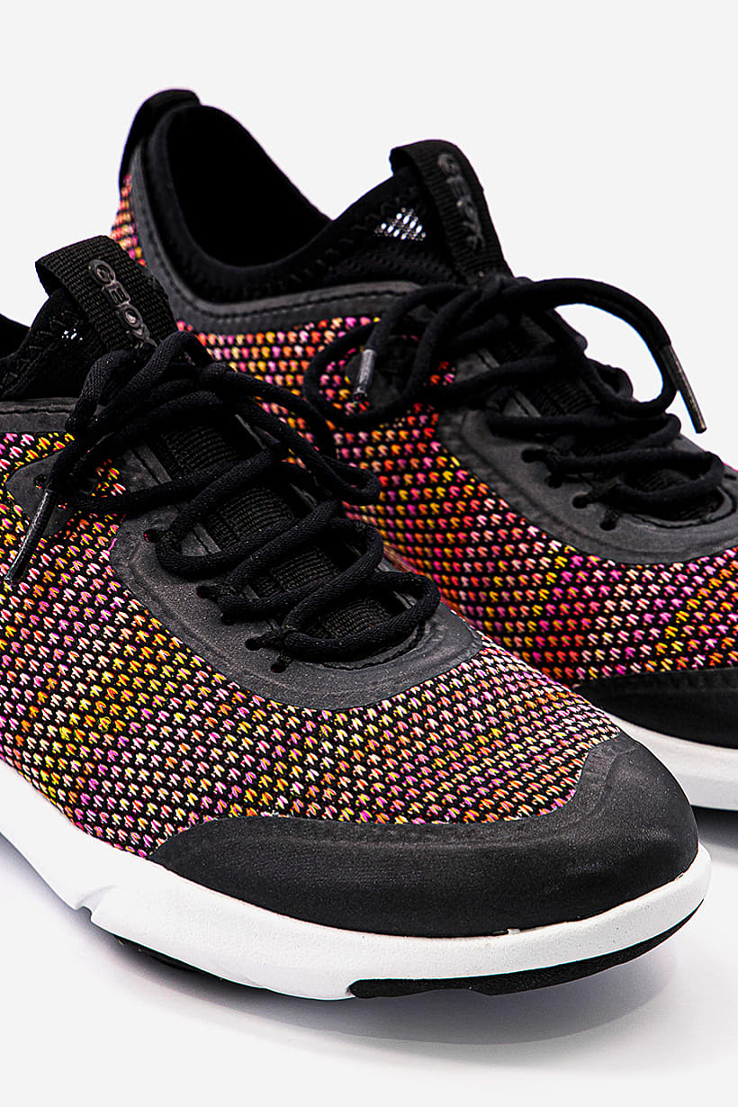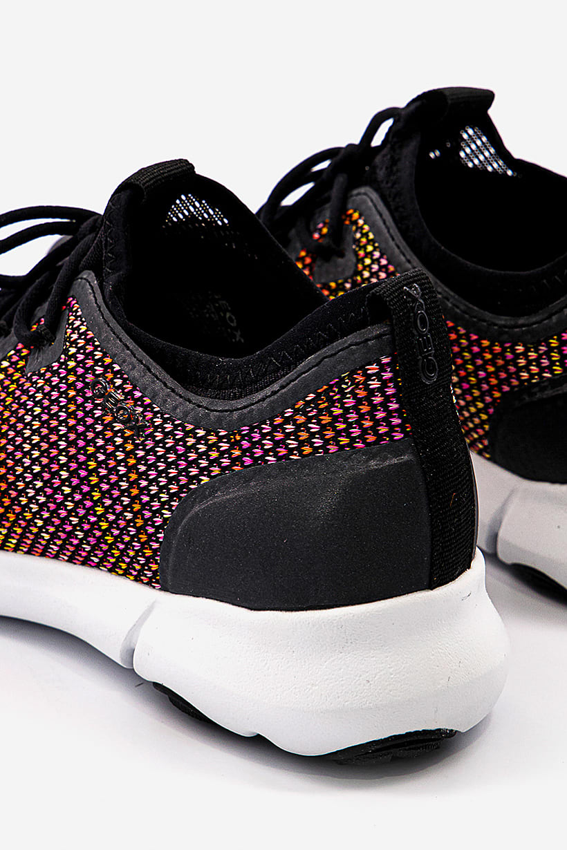 Black and Orange Lace Up Running Shoes for Women with Nebula Design.