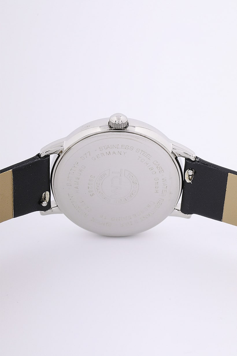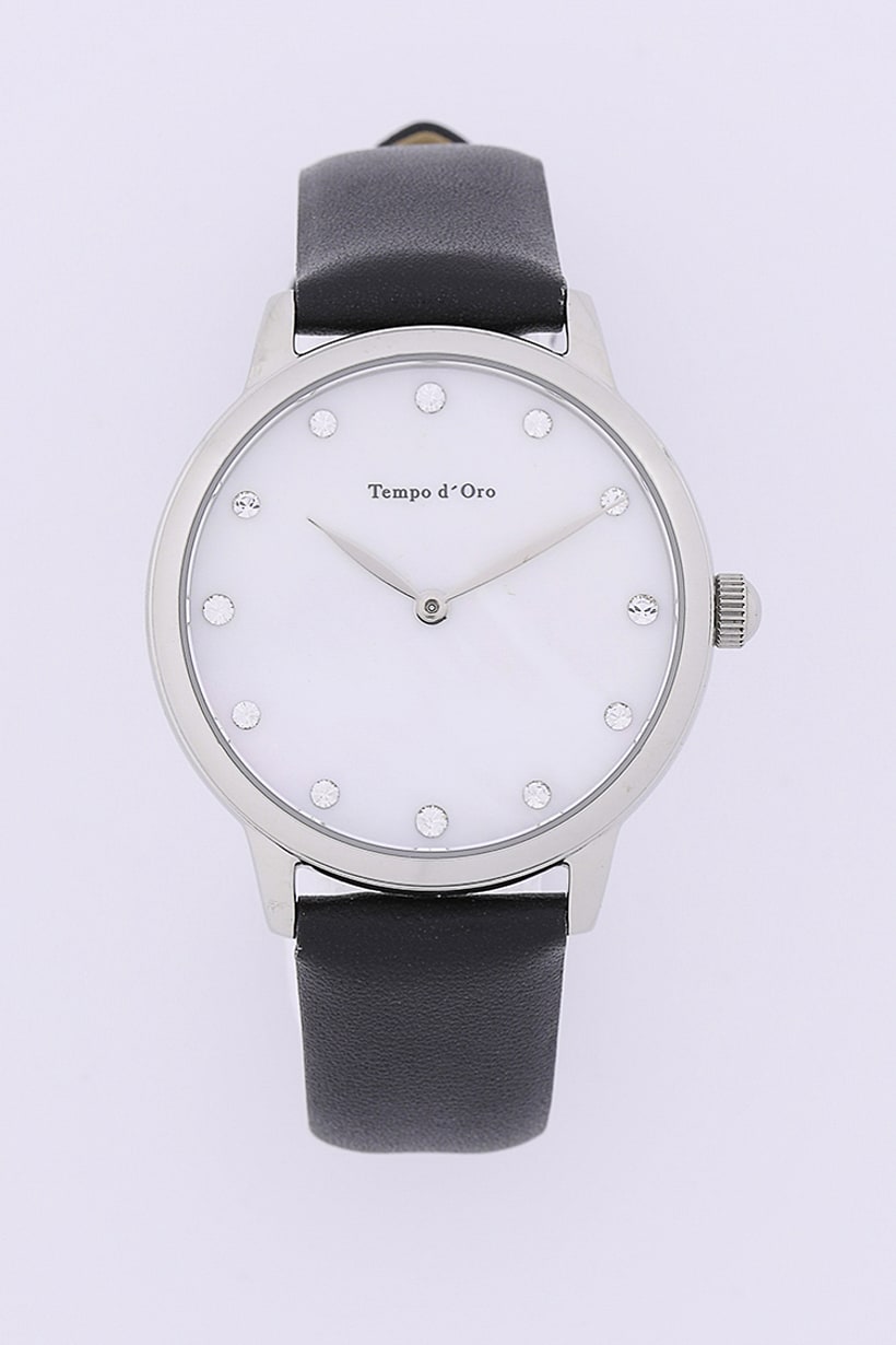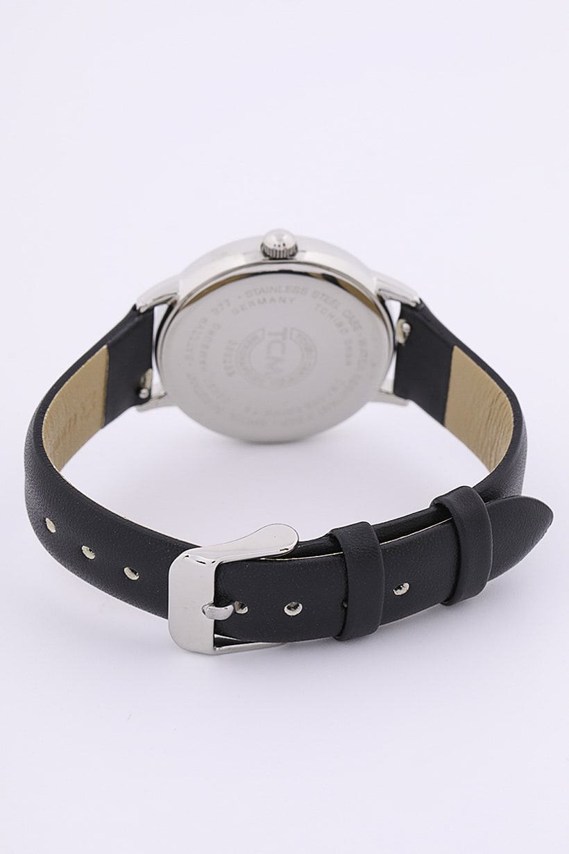 This watch features a black leather strap and a glass dial window. It is an analog watch that is ideal for women and comes with a buckle closure. The markers are displayed on the dial and it makes for a great gift. Please note that the product color may vary slightly due to lighting or monitor settings. The color family of this watch is black.