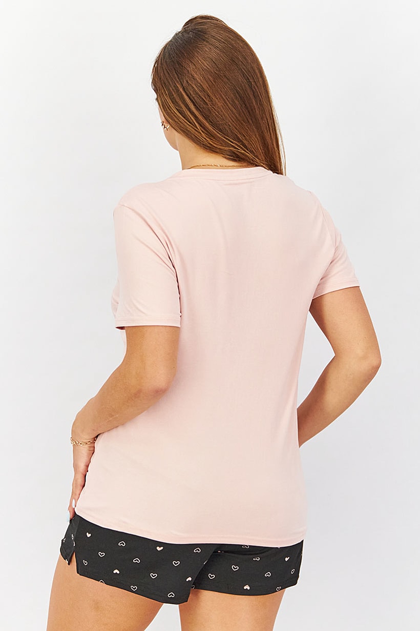This product is suitable for women and can be easily washed in a machine. It is a set of pyjamas with a crew neckline and short sleeves. The bottom closure is a drawstring and it has a pullover style. The fabric is made of 95% polyester and 5% elastane, with a graphic print in pink color. It is perfect for homewear and may have slight color variations due to photographic lighting or monitor settings. The size shown is international.