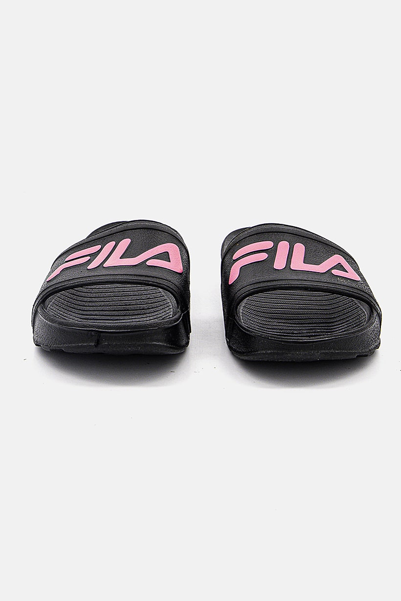 Black and pink sleek slides with brand logo for girls.