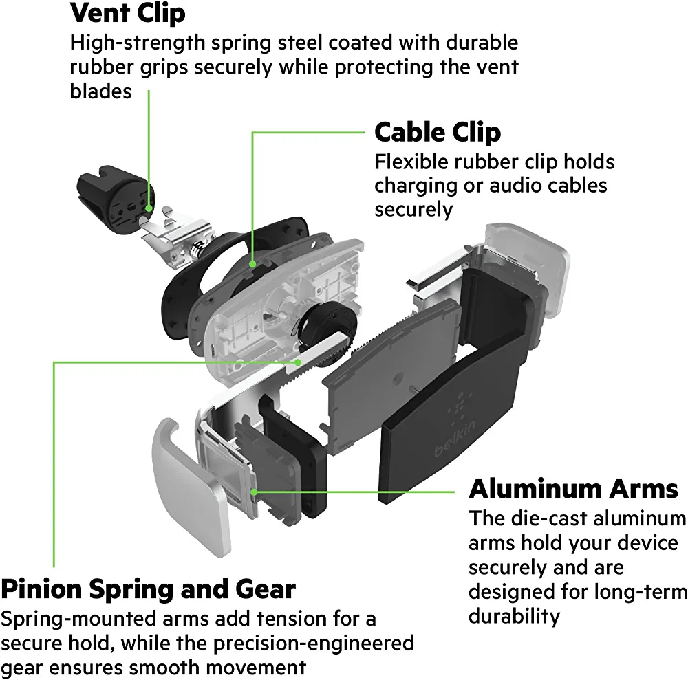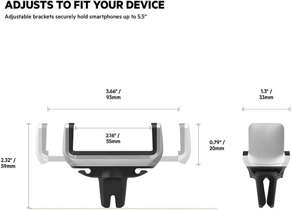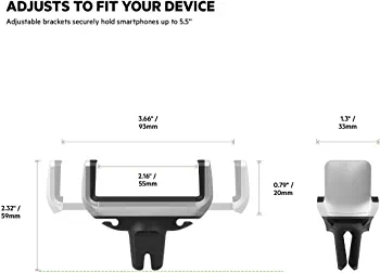 The Belkin Car Vent Mount is a must-have for hassle-free cable management and easy phone access while driving. Its precision-crafted design features die-cast arms and a matte finish for a sleek look. The mount can be adjusted to fit almost any smartphone, with a low-profile design that clips onto most vents. It accommodates cases up to 3mm thick and expands to fit screen sizes up to 5.5 inches. The mount also features a 180-degree rotation design, allowing you to position your phone in portrait or landscape mode for optimal viewing. Use portrait mode for hands-free calls or charging, and landscape mode for navigation apps.