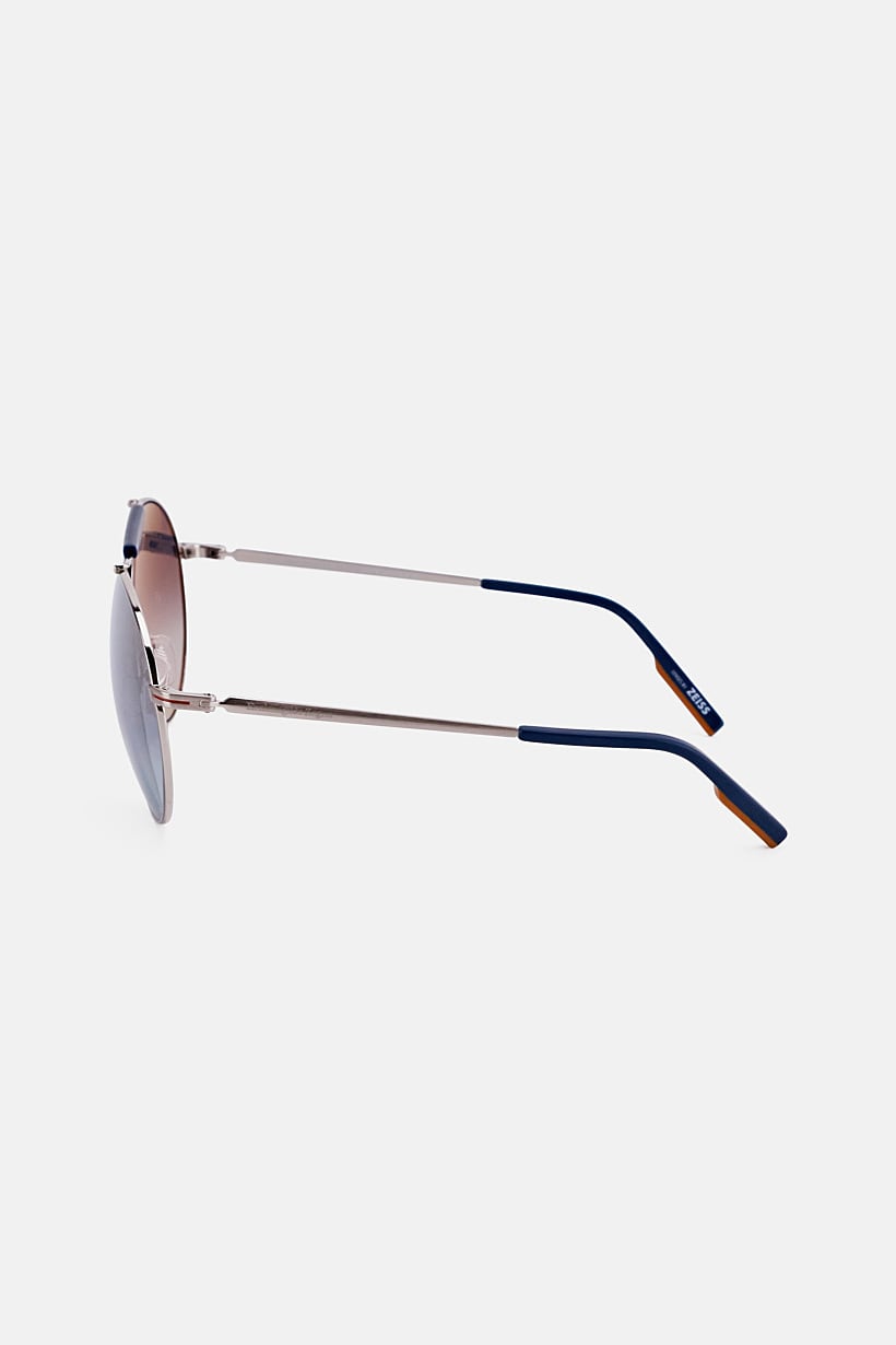 This product boasts a sleek silver frame with a full rim design, complemented by black lenses that provide reliable protection against harmful UV rays. The lenses are crafted from high-quality glass, and the sunglasses also feature adjustable nose pads for a comfortable fit. The color family of this product is black.