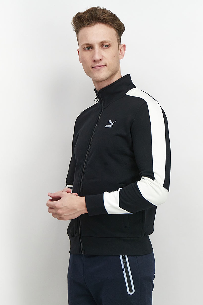 This product is machine washable and has a sportswear fit. The size shown is Asian and it has long sleeves with a medium thickness. The neckline and collar are mock, making it suitable for training. Please note that the product color may vary slightly due to lighting or monitor settings. It is made of 100% cotton and features a brand logo pattern and print. This is a sweater type of sportswear with a zipper closure and comes in the color black.