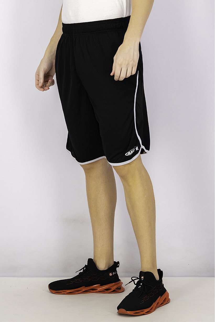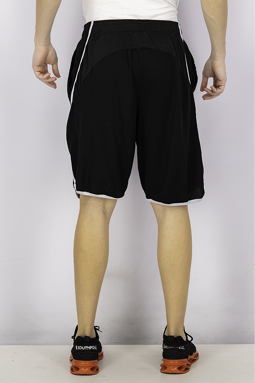 Black and white drawstring basketball shorts for men’s sportswear.