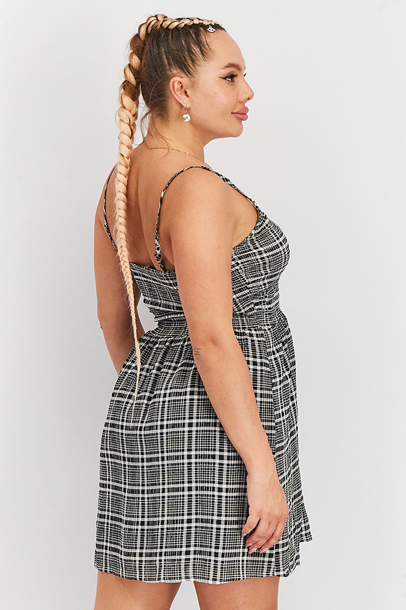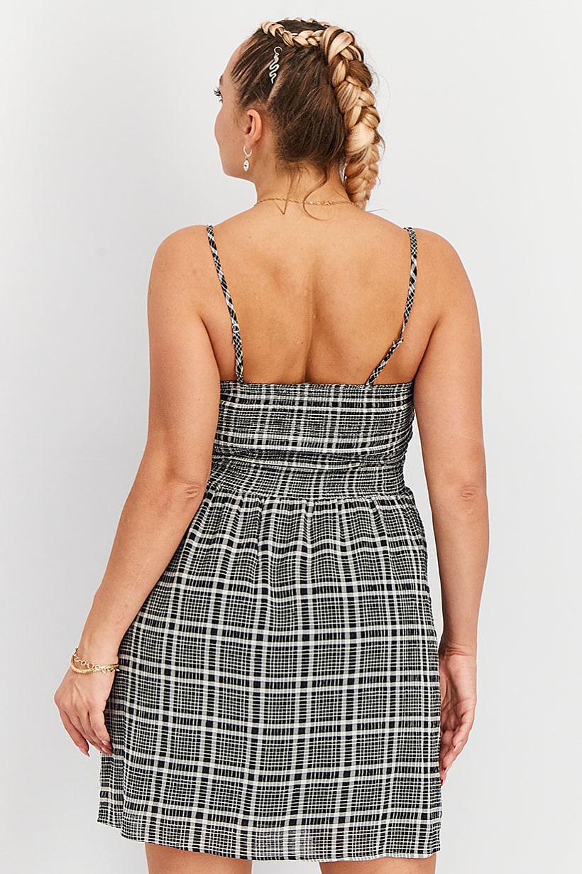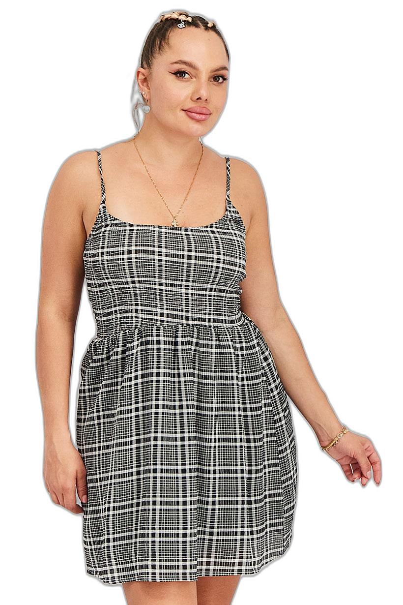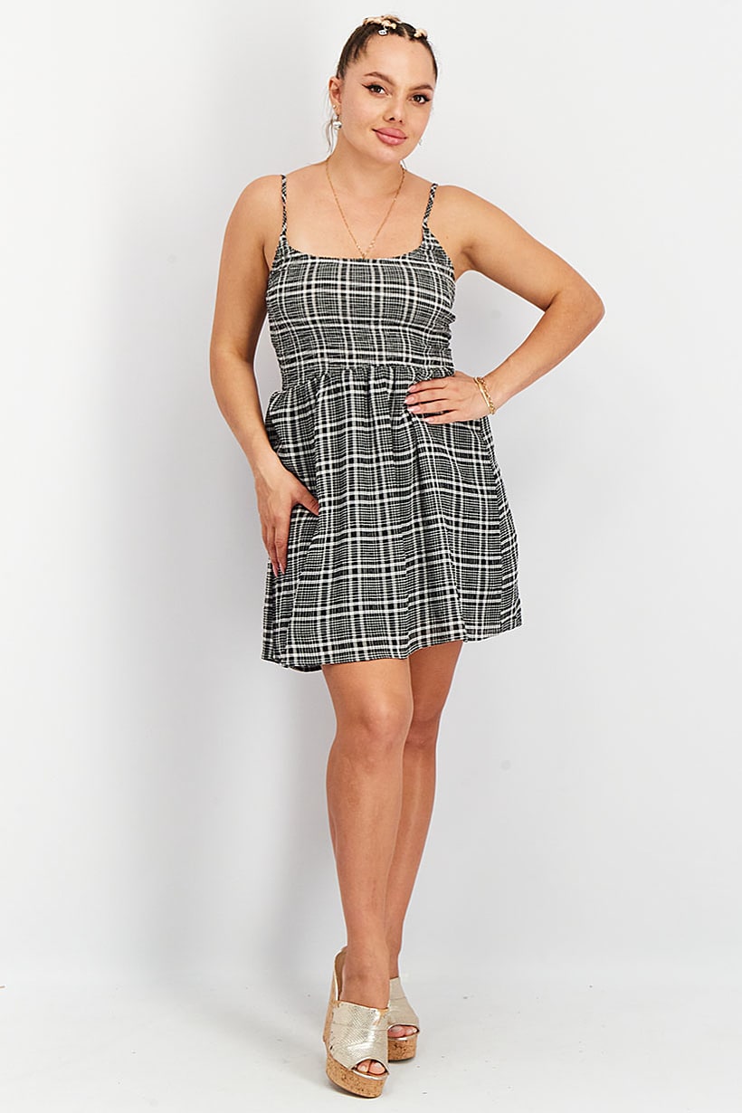 Black and white plaid mini dress without sleeves for women.